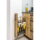 Meble kuchenne wyposażone w cargo, czyli wysuwany system z półkami są doskonałe do przechowywania większej ilości produktów i zapasów żywności. Zajmują relatywnie niewiele miejsca, ale same w sobie są bardzo pojemne. Dodatkowo płaski, podwójny reling oraz jego dopasowana wysokość gwarantują stabilność nawet dla wysokich produktów. Dzięki cargo każdy przedmiot ma swoje miejsce, a w kuchni panuje porządek. Szeroki wybór rozmiarów: 150, 200, 300, 400 i 500 mm sprawia, że system ofertowany przez GTV można dopasować niemalże do każdej wnęki.