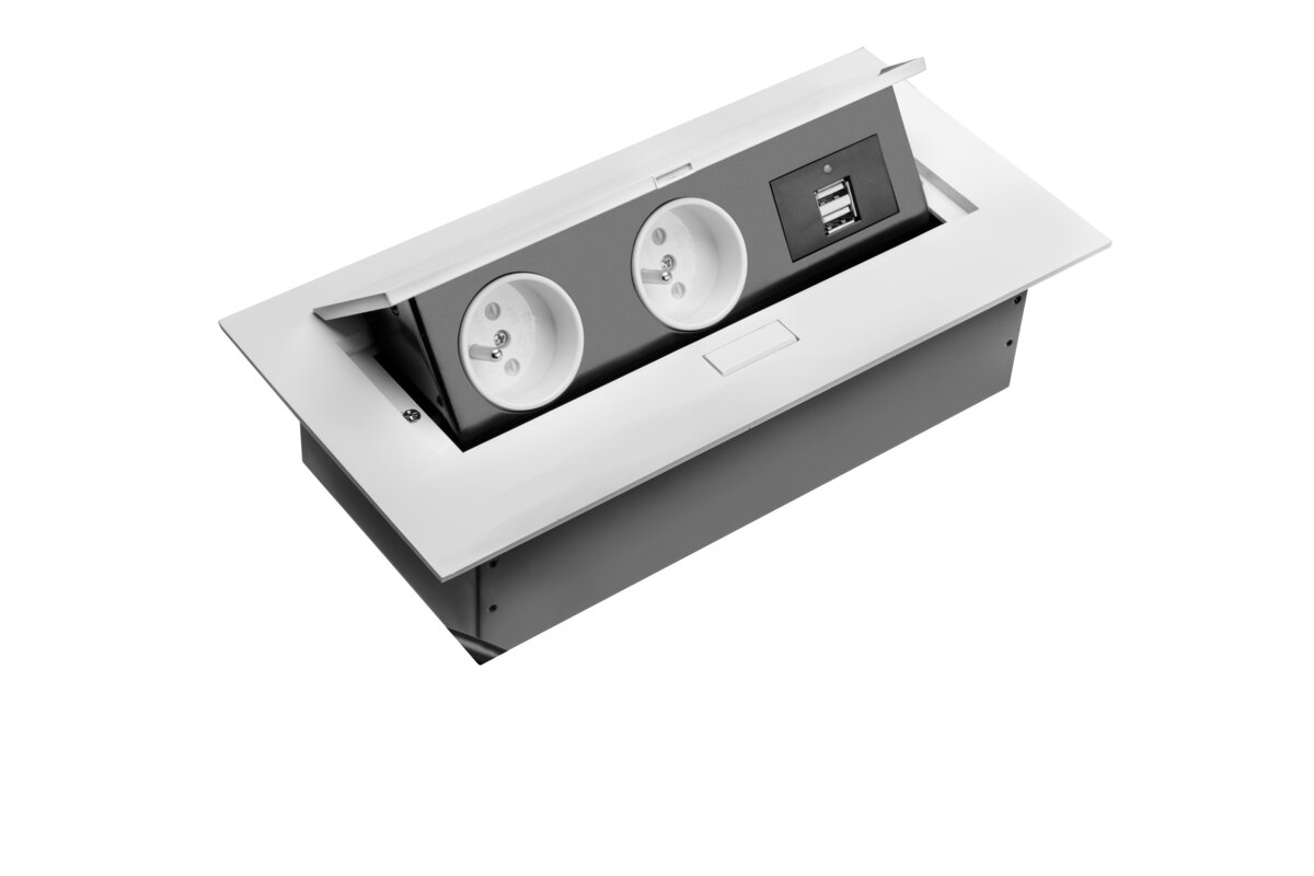Klasyczne, prostokątne gniazdo wpuszczane w blat będzie świetnym rozwiązaniem dla minimalistów i osób ceniących prostotę. Subtelnie licuje z powierzchnią każdego biurka lub stołu. Dostępne jest w standardowych kolorach dopasowanych do większości blatów: białym, czarnym i aluminium. Produkt występuje w wariantach z 3 gniazdami zasilającymi oraz 2 gniazdami zasilającymi i 2 gniazdami USB-A. Oszczędność miejsca – po skończonej pracy możesz go po prostu schować w blacie. 2 gniazda USB do ładowania urządzeń mobilnych – max 2A. Niewielkie rozmiary – do montażu trzeba wyciąć otwór o wymiarach 22×11 cm. Urządzenie dostarczane jest z przewodem zasilającym o długości 150 cm.