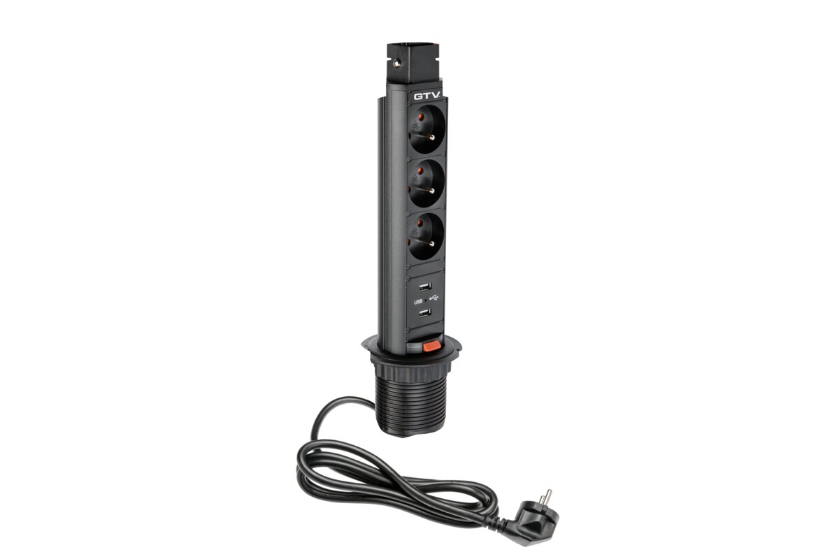 Wysuwane gniazdo meblowe to jedno z najpopularniejszych rozwiązań na rynku. Dostosowane jest do niedużych przestrzeni – małych biurek, stolików, blatów kuchennych. Po wysunięciu mamy do dyspozycji trzy gniazda prądowe i dwa gniazda USB do ładowania urządzeń mobilnych. Gniazdo zakończone jest estetyczną pokrywką. Dostępne w dwóch uniwersalnych kolorach: czarnym i srebrnym. Oszczędność miejsca – po skończonej pracy możesz go po prostu schować w blacie. 2 gniazda USB do ładowania urządzeń mobilnych – max 2A. Niewielkie rozmiary – do montażu wystarczy nawiercić otwór o średnicy zalewdwie 60 mm.Prosta instalacja – osadzenie w blacie następuje poprzez dokręcenie plastikowej nakrętki. Urządzenie dostarczane jest z przewodem zasilającym o długości 150 cm.
