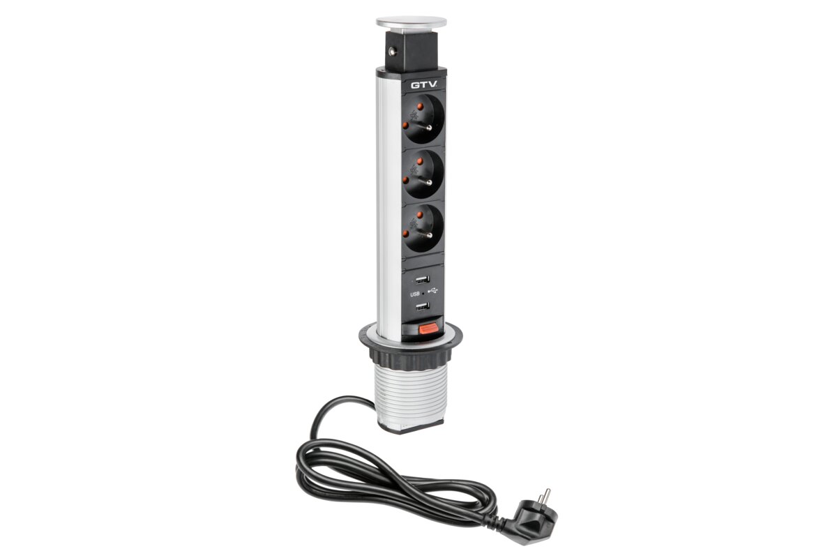 Wysuwane gniazdo meblowe to jedno z najpopularniejszych rozwiązań na rynku. Dostosowane jest do niedużych przestrzeni – małych biurek, stolików, blatów kuchennych. Po wysunięciu mamy do dyspozycji trzy gniazda prądowe i dwa gniazda USB do ładowania urządzeń mobilnych. Gniazdo zakończone jest estetyczną pokrywką. Dostępne w dwóch uniwersalnych kolorach: czarnym i srebrnym. Oszczędność miejsca – po skończonej pracy możesz go po prostu schować w blacie. 2 gniazda USB do ładowania urządzeń mobilnych – max 2A. Niewielkie rozmiary – do montażu wystarczy nawiercić otwór o średnicy zalewdwie 60 mm. Prosta instalacja – osadzenie w blacie następuje poprzez dokręcenie plastikowej nakrętki. Urządzenie dostarczane jest z przewodem zasilającym o długości 150 cm.