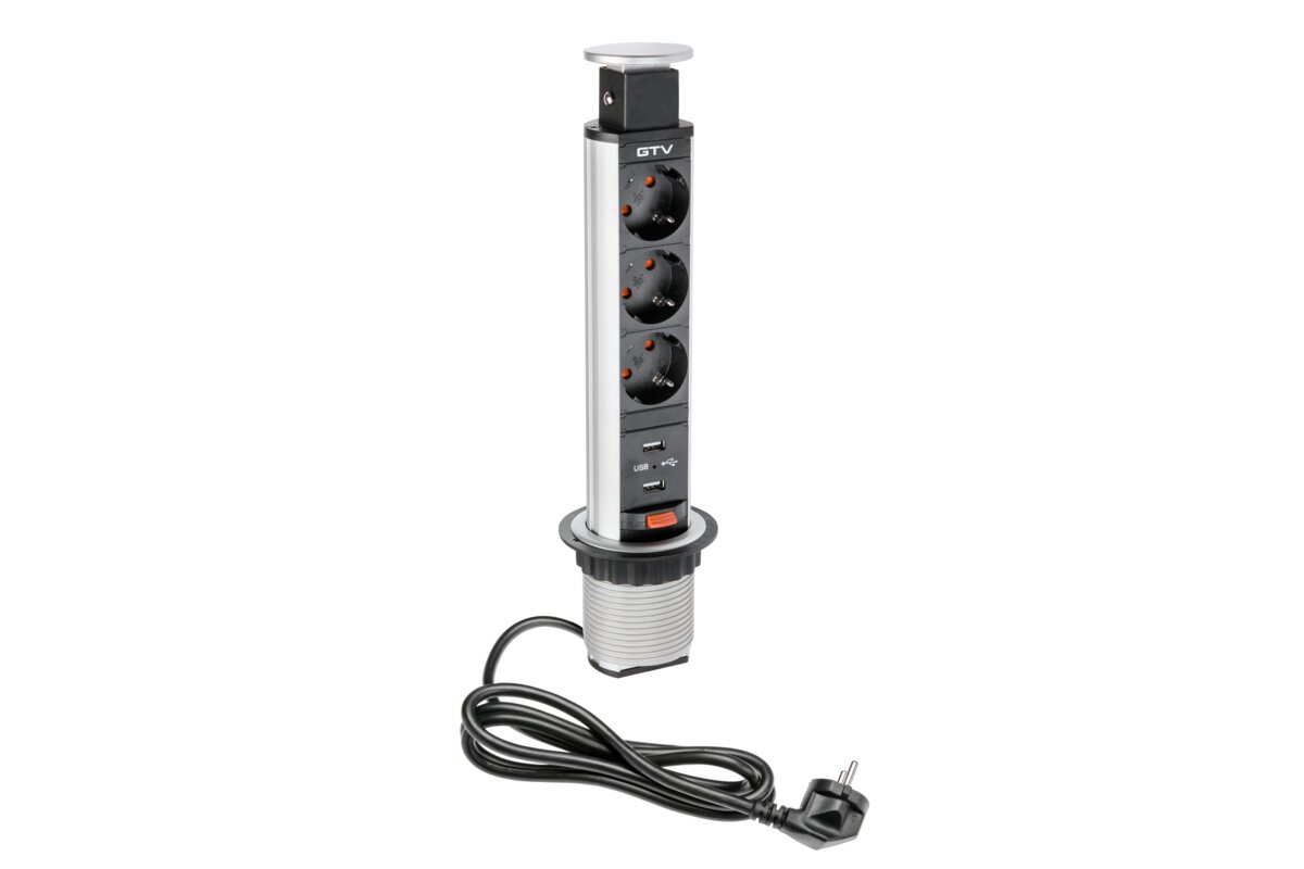 Wysuwane gniazdo meblowe to jedno z najpopularniejszych rozwiązań na rynku. Dostosowane jest do niedużych przestrzeni – małych biurek, stolików, blatów kuchennych. Po wysunięciu mamy do dyspozycji trzy gniazda prądowe i dwa gniazda USB do ładowania urządzeń mobilnych. Gniazdo zakończone jest estetyczną pokrywką. Dostępne w dwóch uniwersalnych kolorach: czarnym i srebrnym. Oszczędność miejsca – po skończonej pracy możesz go po prostu schować w blacie.2 gniazda USB do ładowania urządzeń mobilnych – max 2A. Niewielkie rozmiary – do montażu wystarczy nawiercić otwór o średnicy zalewdwie 60 mm. Prosta instalacja – osadzenie w blacie następuje poprzez dokręcenie plastikowej nakrętki. Urządzenie dostarczane jest z przewodem zasilającym o długości 150 cm.