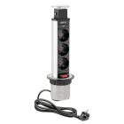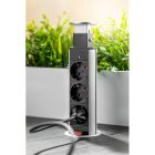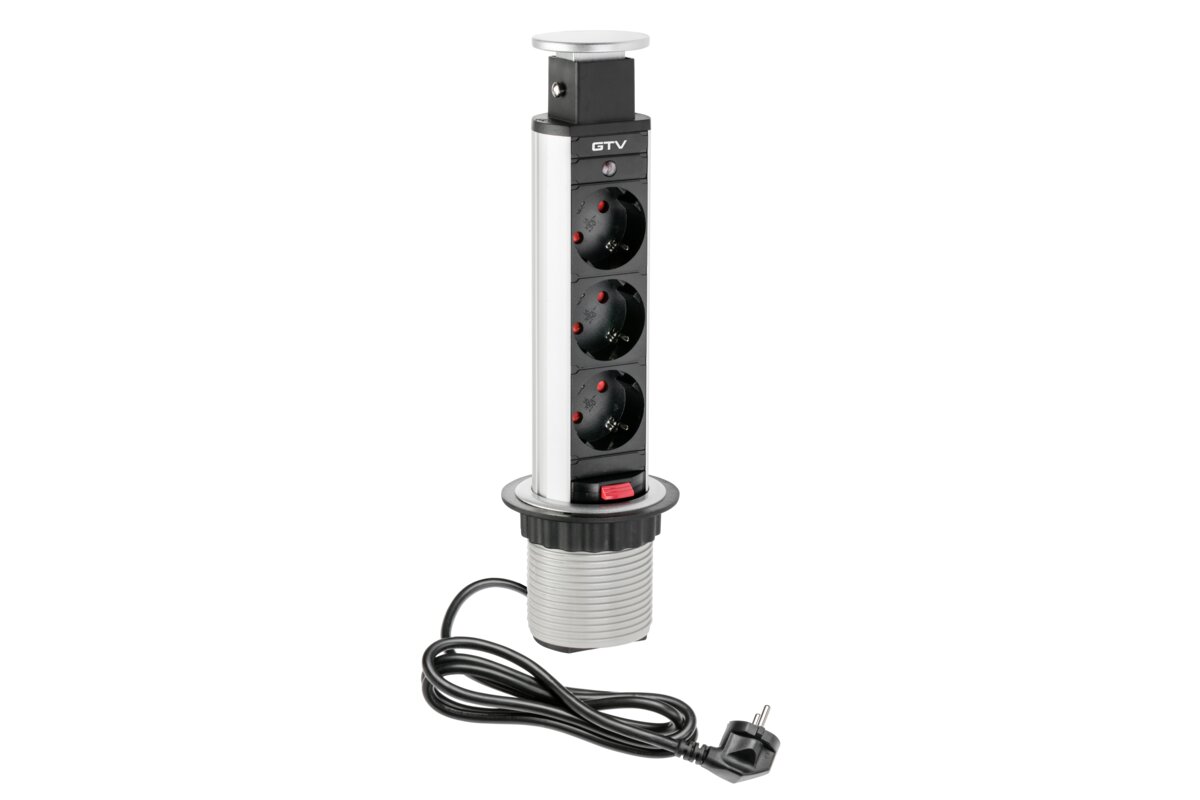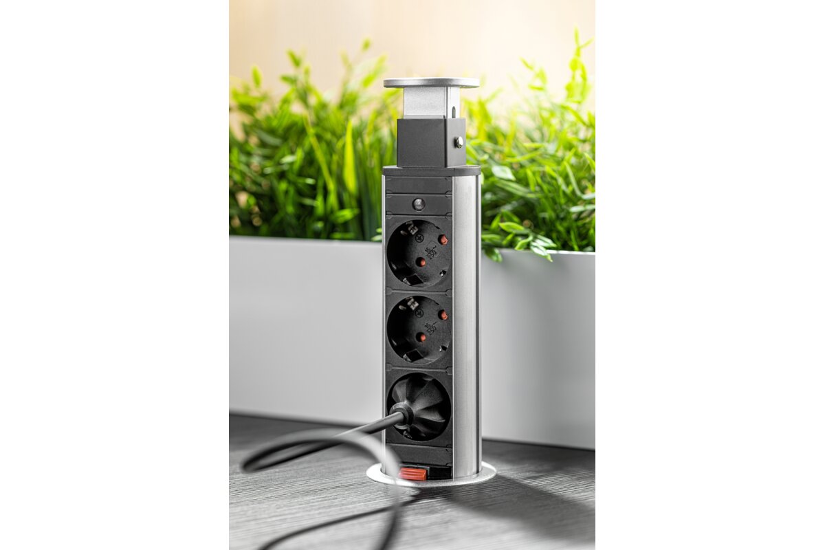 Wysuwane gniazdo meblowe to jedno z najpopularniejszych rozwiązań na rynku. Dostosowane jest do niedużych przestrzeni – małych biurek, stolików, blatów kuchennych. Po wysunięciu mamy do dyspozycji trzy gniazda prądowe i dwa gniazda USB do ładowania urządzeń mobilnych. Gniazdo zakończone jest estetyczną pokrywką. Dostępne w dwóch uniwersalnych kolorach: czarnym i srebrnym. Oszczędność miejsca – po skończonej pracy możesz go po prostu schować w blacie. Niewielkie rozmiary – do montażu wystarczy nawiercić otwór o średnicy zalewdwie 60 mm. Prosta instalacja – osadzenie w blacie następuje poprzez dokręcenie plastikowej nakrętki. Urządzenie dostarczane jest z przewodem zasilającym o długości 150 cm.