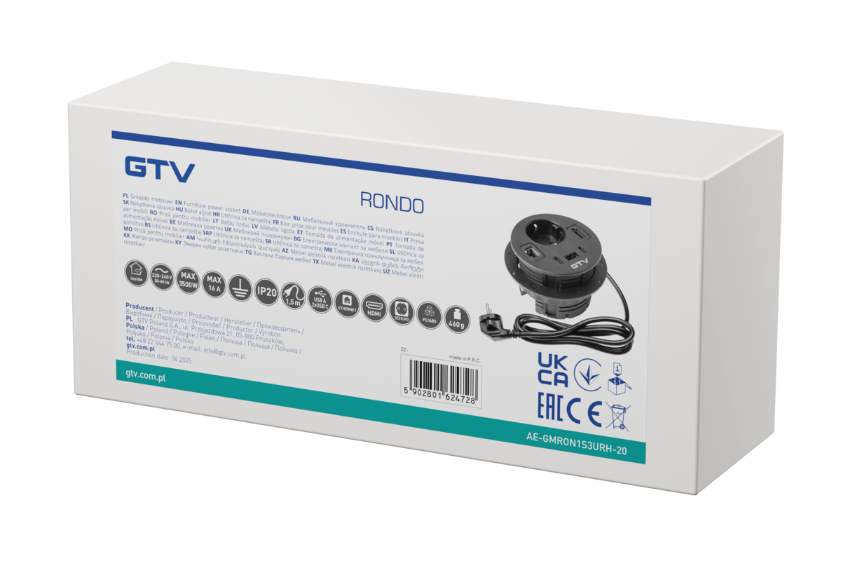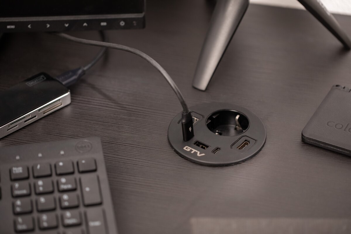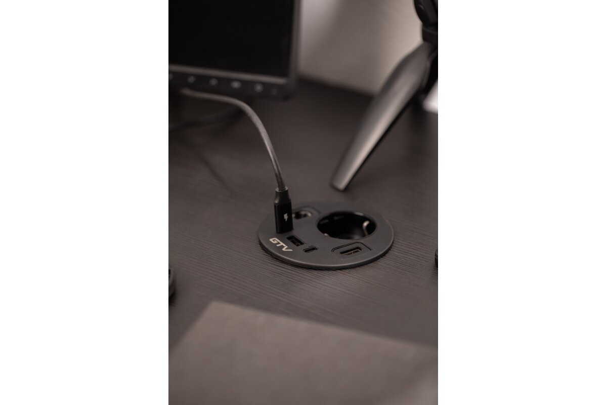 RONDO to okrągłe gniazdo meblowe, które łączy elegancki design z maksymalną funkcjonalnością. Dzięki różnorodnym portom – Schuko, USB-A oraz dwóm USB-C – pozwala na szybkie i wygodne ładowanie wielu urządzeń jednocześnie. Dodatkowo wyposażono je w złącza RJ45 i HDMI, co czyni je idealnym rozwiązaniem do nowoczesnych biur, sal konferencyjnych i domowych stanowisk pracy. Dostępne w eleganckiej czerni – doskonale wkomponuje się w każdy wystrój wnętrza. Przewód o długości 1,5 m zapewnia swobodę montażu i komfort użytkowania.