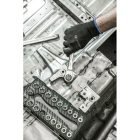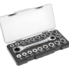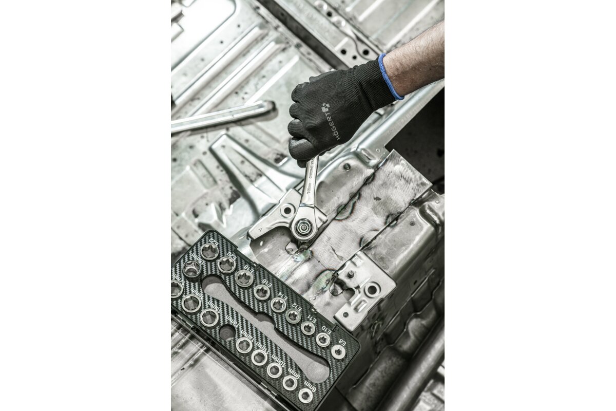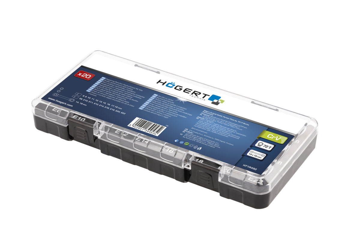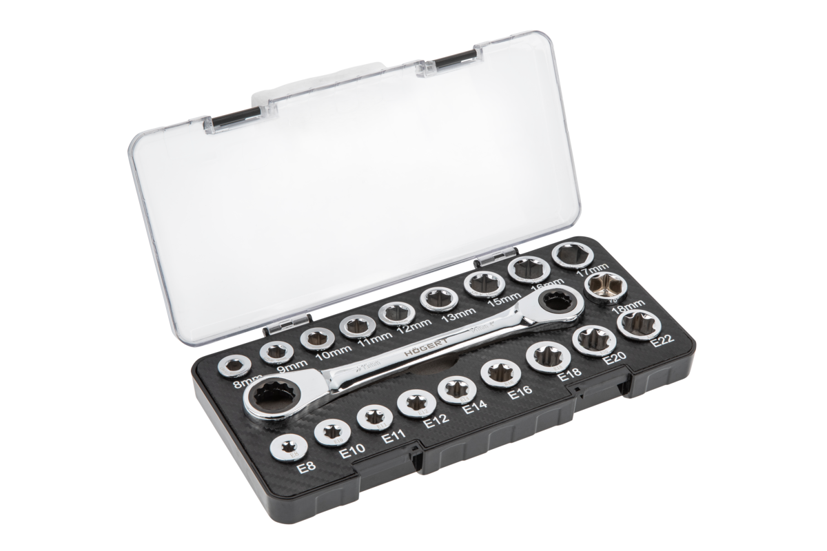 Klucz z grzechotką i zestawem nasadek służy do odkręcania i przykręcania połączeń gwintowanych zakończonych elementem mocującym sześciokątnym oraz TORX. Dzięki grzechotce nie zachodzi potrzeba przekładania klucza, natomiast nasadki umożliwiają pracę ze śrubami w różnych rozmiarach. 20-elementowy zestaw umożliwia pracę w zakresie od 8 do 19 mm/ E8 – E22 mm. Uniwersalne zastosowanie klucza pozwala na jego użycie zarówno w warsztacie, jak i pracach remontowo – budowlanych oraz instalatorskich.