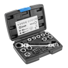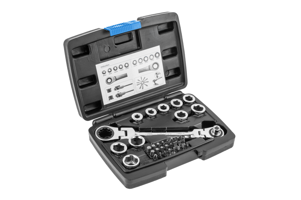 Klucz z grzechotką z przegubem i zestawem specjalnych nasadek, który doskonale sprawdzi się przy odkręcaniu i przykręcaniu połączeń gwintowanych zakończonych elementem mocującym sześciokątnym. Dzięki grzechotce nie zachodzi potrzeba przekładania klucza, natomiast nasadki umożliwiają pracę ze śrubami w różnych rozmiarach. 36-elementowy zestaw umożliwia uzyskanie pełnego zestawu kluczy w rozmiarach 8 – 19 mm. Dodatkowo zawiera 24 końcówki wkrętakowe wraz z adapterem. Uniwersalne zastosowanie klucza pozwala na jego użycie zarówno w warsztacie, jak i pracach remontowo – budowlanych oraz instalatorskich.