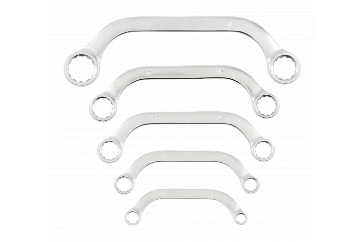 Zestaw pięciu kluczy oczkowych. Klucze dzięki specjalnemu profilowi w kształcie litery C umożliwiają odkręcenie śrub w trudno dostępnych miejscach, np. przy rozrusznikach, kolektorach i alternatorach.
