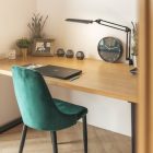 Nowoczesna lampka biurkowa utrzymana w stylistyce przemysłowej, przypomina swoim wyglądem lampy kreślarskie wykorzystywane w biurach projektowych.