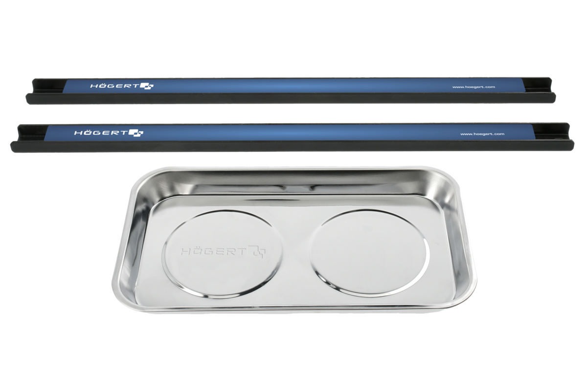 Zestaw dwóch listew magnetycznych do zawieszania narzędzi oraz miski do przechowywania drobnych elementów. Listwy pozwalają przywiesić najczęściej używane narzędzia np. wkrętaki, klucze, bity, szczypce. Misę można przyczepić do samochodu lub szafki warsztatowej, podnośnika kolumnowego i odkładać do niej różnorodne metalowe elementy np. śruby, podkładki, sprężyny, pierścienie itp. Zestaw jest przydatny w każdym warsztacie.