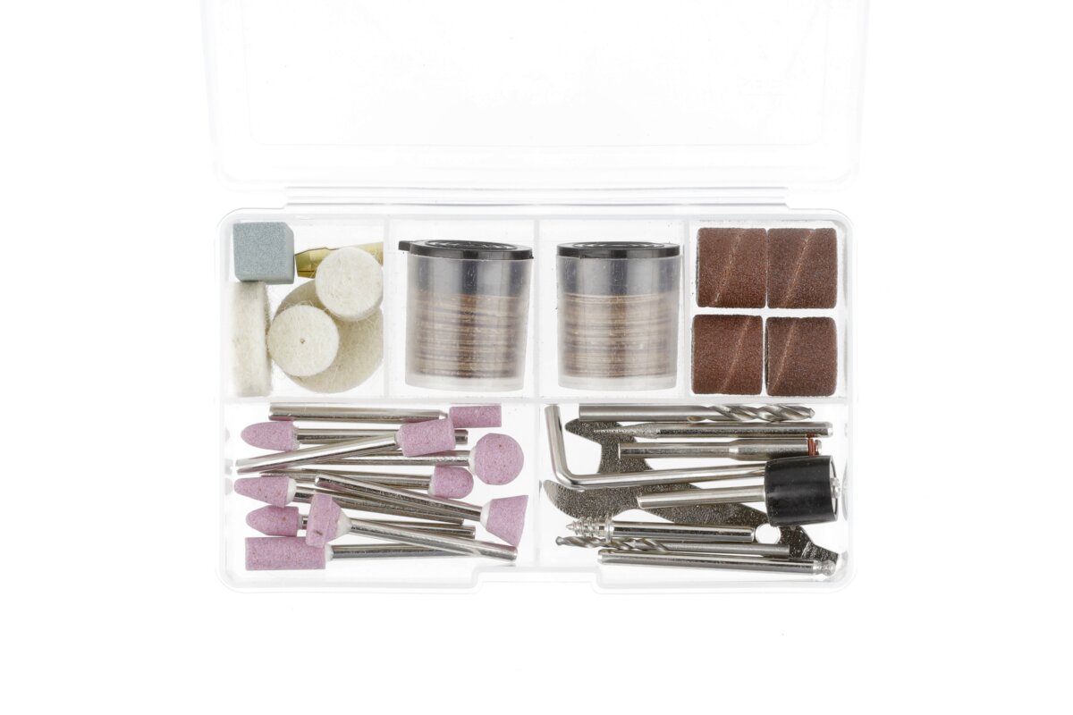 - w zestawie 184 dodatkowych akcesoriów, w tym elastyczny wałek przedłużający, uchwyt i osłonę oraz wiele tarcz, krążków ściernych i polerskich, itp.