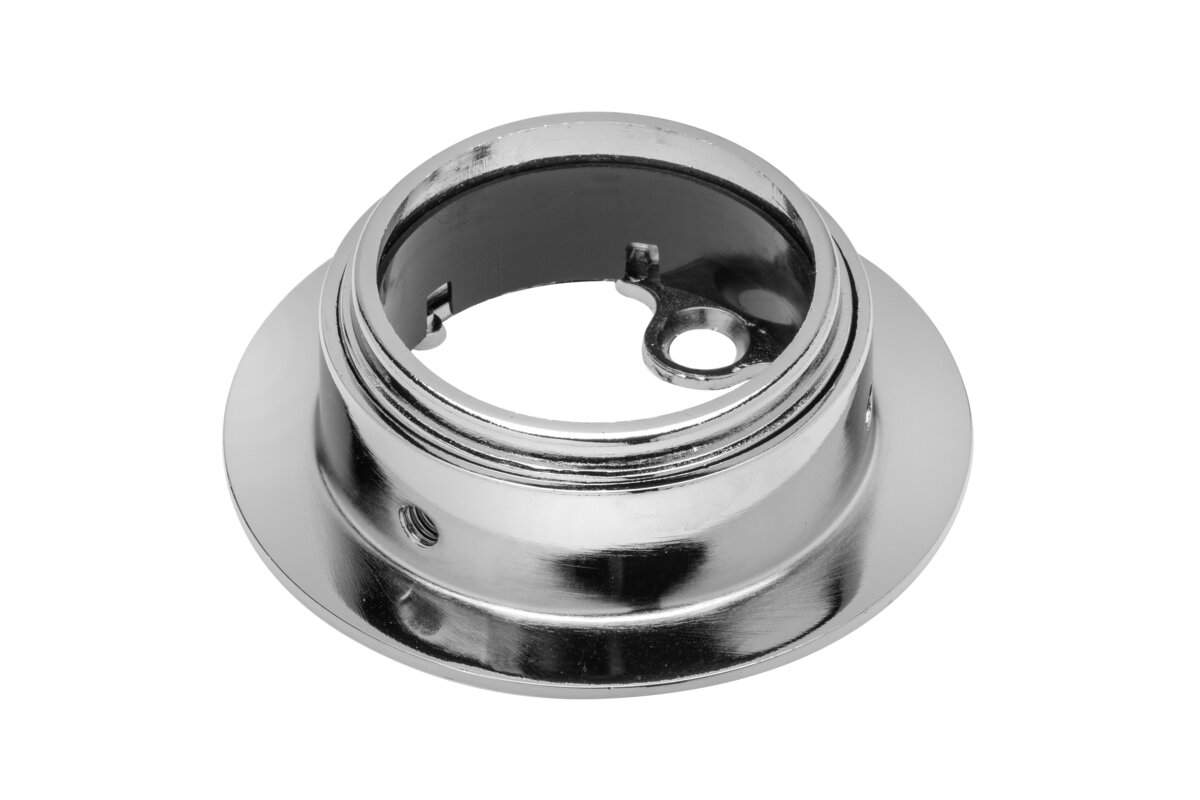 Mocowanie dolne do drążka okrągłego o średnicy 50 mm w kolorze chromu, wykonane ze stali. Zawiera dwa otwory montażowe. Znajduje swoje zastosowanie w systemach modułowych do zabudowy, wykorzystywanych do przechowywania mi.n. ubrań.
