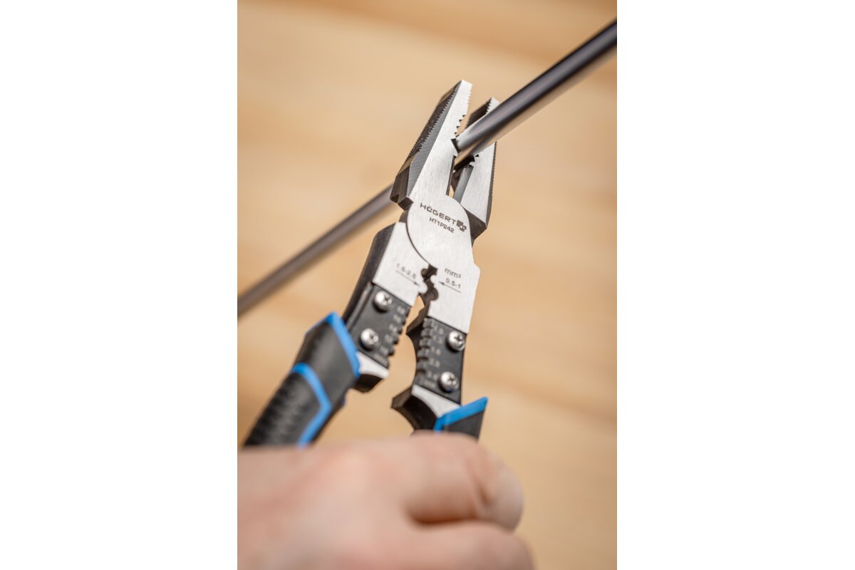 Uniwersalne narzędzie 9 w 1, łączące w sobie wiele funkcji użytkowych, pozwalających na wygodne i szybkie wykonywanie zróżnicowanych prac. Oszczędzasz miejsce na kilka narzędzi i obniżasz wagę torby narzędziowej. Szeroka końcówka szczypiec umożliwia pewne zaciskanie miękkich materiałów, przytrzymywanie obiektów do średnicy 50 mm, ściskanie, zakręcanie, wyciąganie, chwytanie. Zewnętrzna, górna powierzchnia szczypiec zaopatrzona jest w pilnik, pozwalający na usuwanie zadziorów i niewielkich nierówności. Zaciskarka zapewnia trwałą obróbkę tulejowych końcówek przewodów elektrycznych 0,5-1,0 oraz 1,5-2,5 mm². Ściągacz izolacji przewodów elektrycznych, dzięki precyzyjnie wyciętym ostrzom, nie uszkadza rdzenia od 1 do 2,6 mm. Wysokiej jakości, równomiernie utwardzona stal chomowo-wanadowa umożliwia intensywne używanie szczypiec do wymagających dużej siły nacisku, ciężkich prac. Zawansowany proces indukcyjnej obróbki cieplnej daje narzędziu wysoką twardość zapobiegającą stępieniu ostrzy. Ich przemyślania geometria ułatwia cięcie. Dokładnie szlifowane, twarde powierzchnie robocze i zęby umożliwiają precyzyjną pracę. Ergonomiczne okładziny uchwytów, wykonane z odpornego na uszkodzenia, a zarazem miękkiego tworzywa TPU dają duży komfort podczas długiej pracy.