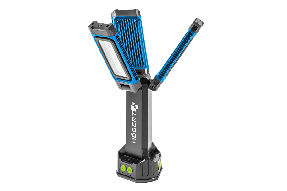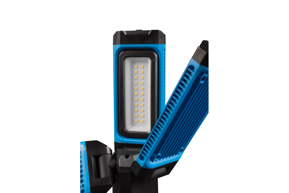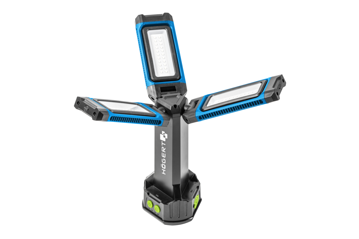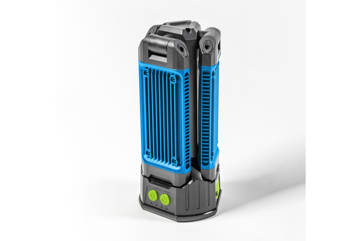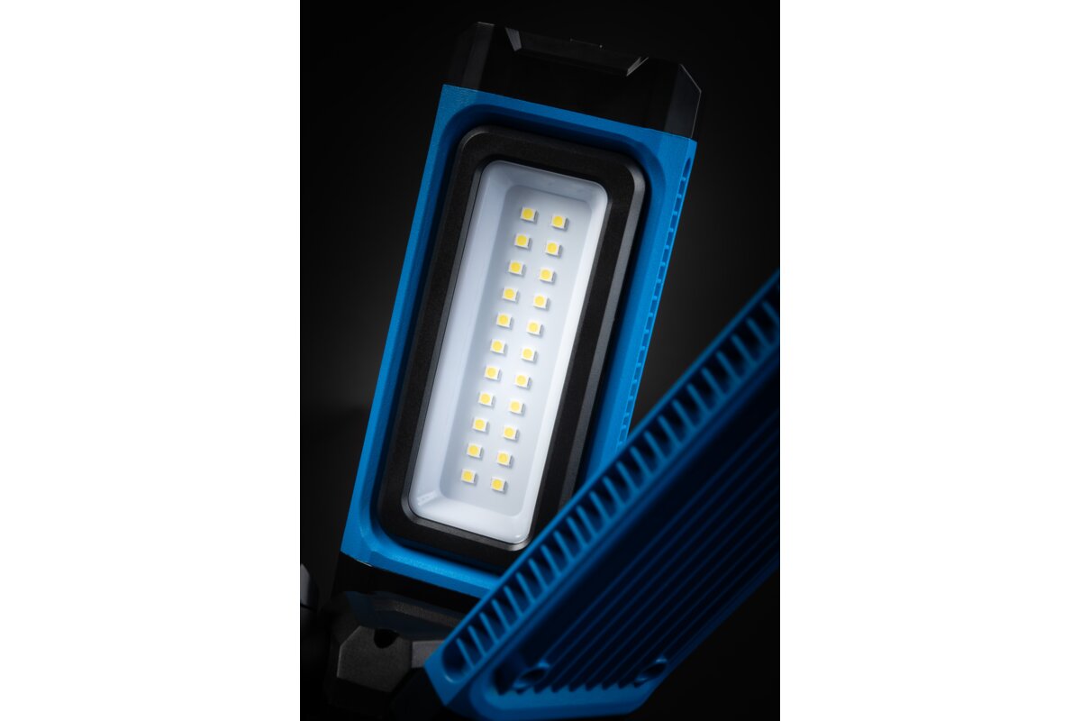 Dookólne oświetlenie robocze, które cechuje się bardzo dobrą jakością emitowanego światła oraz wysoką odpornością na uszkodzenia i trwałością. Dzięki kątowi świecenia 360° oraz indywidualnemu ustawieniu kąta każdego z 3 reflektorów, daje ogromne możliwości dostosowania go do aktualnych potrzeb i warunków. Wysokiej jakości diody LED świecą białym światłem, nie oślepiając oraz zapewniając rozległe oświetlenie. Nadaje się do prac w najtudniejszych warunkach – budowlanych, wykończeniowych, remontowych, warsztatowych oraz na zewnątrz pomieszczeń. Lampa zasilana jest wydajnym akumulatorem, zapewniającym stałą pracę nawet do 5 godzin. Mocne magnesy oraz składany hak do zawieszenia umozliwiają zamontowanie nawietlacza w dowolnym miejscu, co pozwala na zwolnienie rąk do pracy. Gniazdo z gwintem 1/4" pozwala na zamontowanie naświetlacza na statywie. Obudowa z wysokim stopniem ochrony IP54 gwarantuje pełną odporność na przenikanie pyłu, zapewniając bezproblemowe działania w najbardziej pylistych środowiskach. Dodatkowo, obudowa chroni przed bryzgami wody z dowolnego kierunku, co umożliwia jej bezpieczne użytkowanie nawet w warunkach intensywnego deszczu. Naświetlacz w razie potrzeby może zasilać inne urządzenia przez gniazdo USB-C i pracowac jako powerbank.