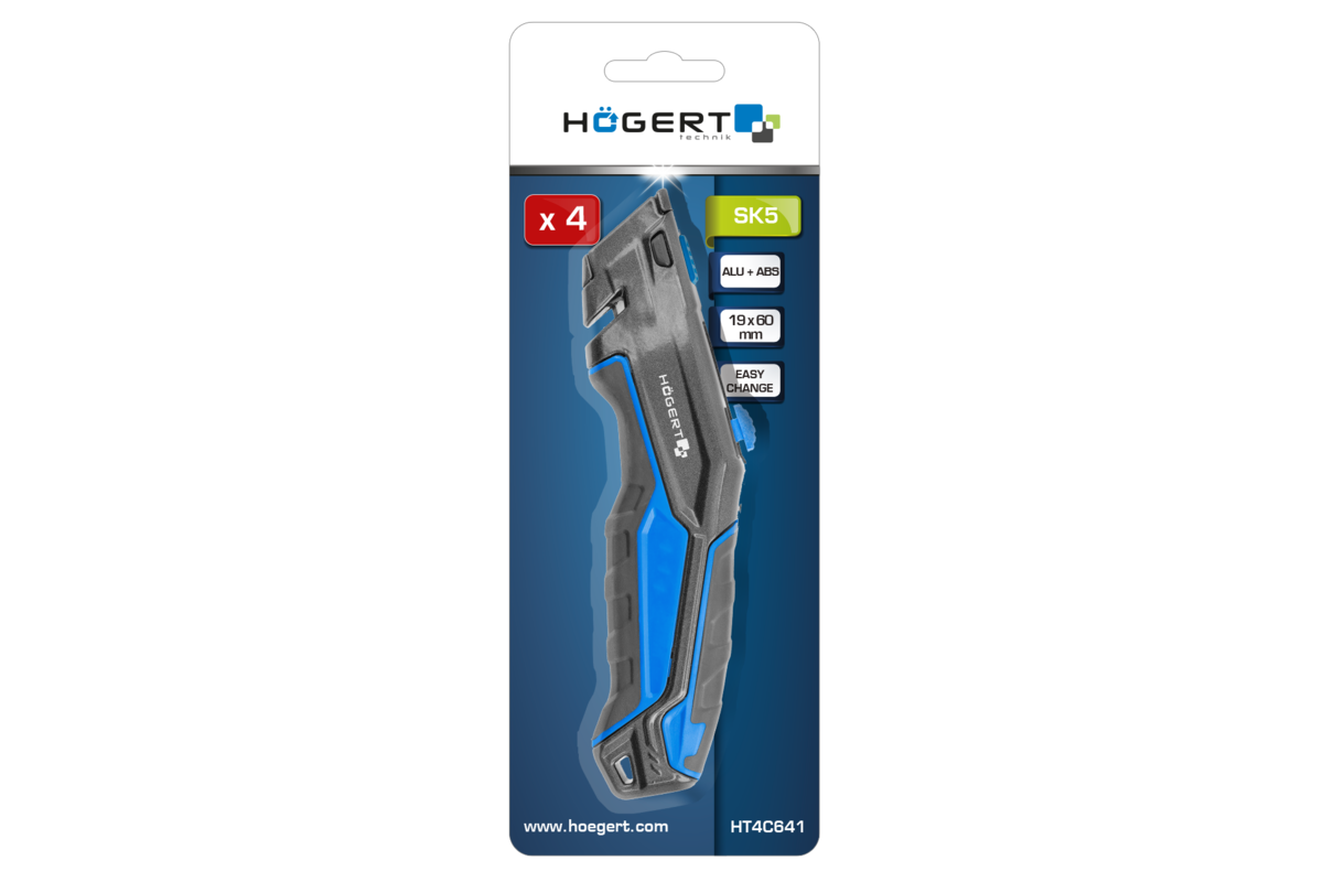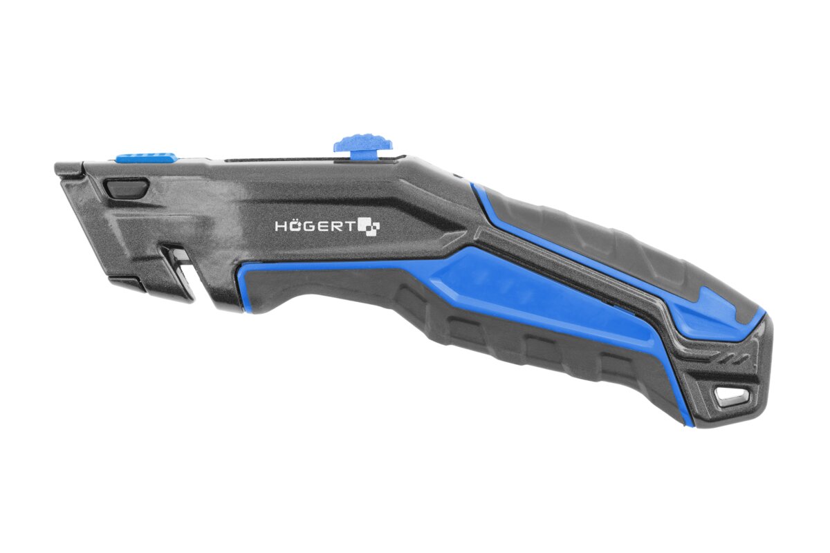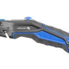 Nóż z ostrzem trapezowym, uniwersalnego zastosowania, pomocny przy do wykonywaniu prac wykończeniowych. Przeznaczony szczególnie do cięcia kartonów, tapet, wykładzin, tkanin plandekowych, folii drukarskich oraz folii PVC, itp.