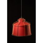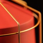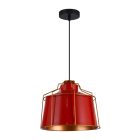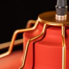 Efektowny wygląd tej lampy został zbudowany na zasadzie kontrastów. Klasyczny, lekko rozszerzający się ku dołowi, czerwony klosz okryty jest ozdobnym złotym stelażem