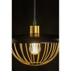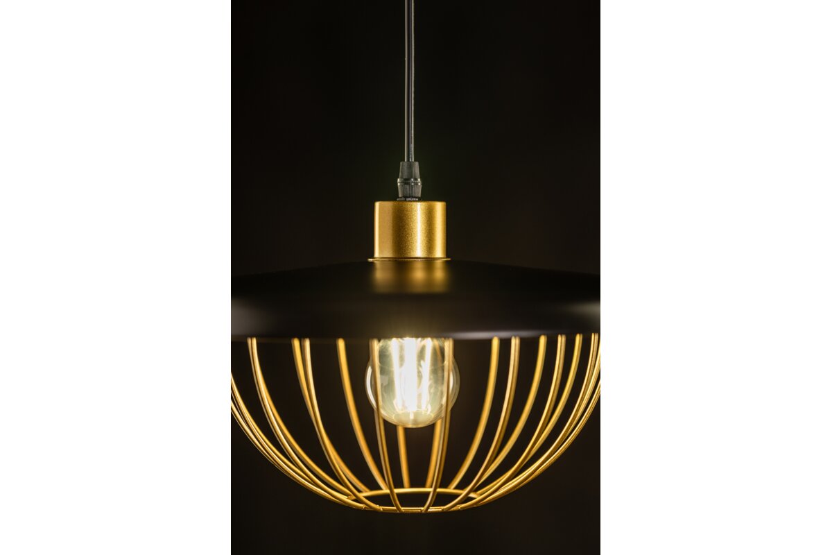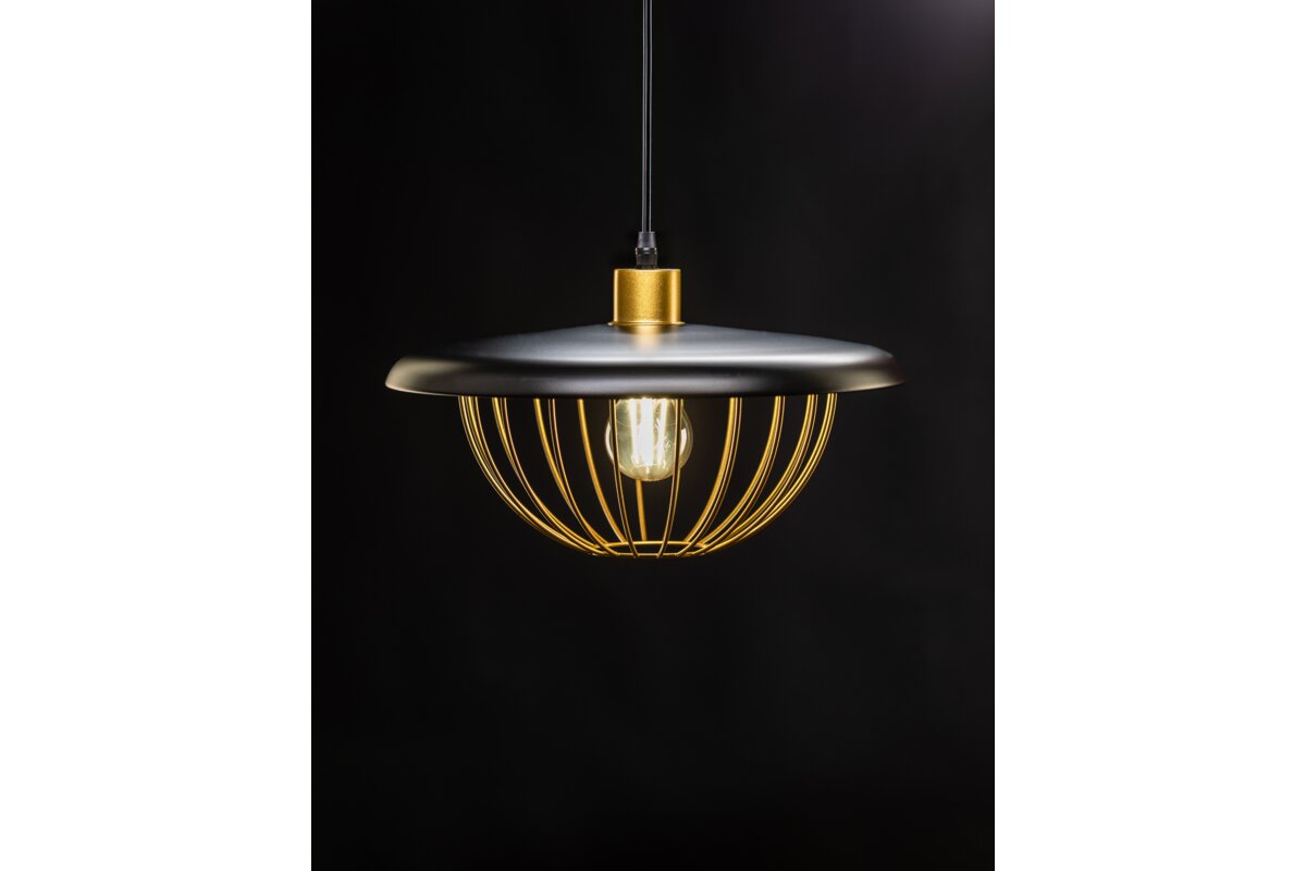 Pojedyncza lampa utrzymana w stylu nowoczesnym z szerokim stalowym rondem w kolorze czarnego matu. Źródło światła zamknięte jest w złotej, drucianej klatce.