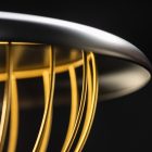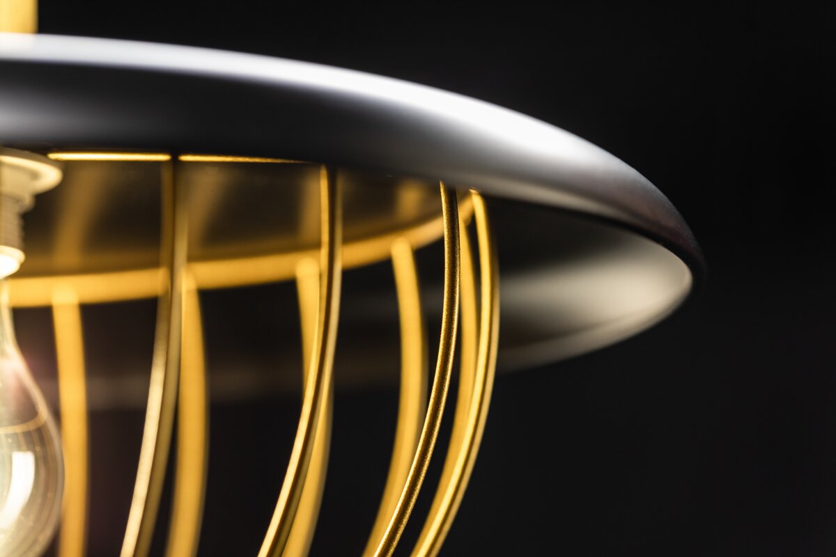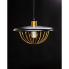 Pojedyncza lampa utrzymana w stylu nowoczesnym z szerokim stalowym rondem w kolorze czarnego matu. Źródło światła zamknięte jest w złotej, drucianej klatce.