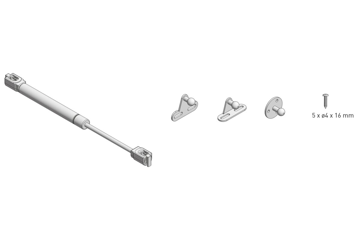 Podnośnik gazowy umożliwia zaprojektowanie funkcjonalnych oraz nowoczesnych szafek górnych. Podnośnik zapewnia płynność oraz amortyzacje przy otwieraniu szafek. Jego mechanizm zapobiega bezwładnemu opadnięciu frontu. Orientacyjny kąt otwarcia wynosi 75- 100° w zależności od użytego zawiasu. Może być stosowany zarówno do frontów pełnych jak i wykonanych z profili aluminiowych. Dostępne 6 wariantów siły produktu. Podczas montażu wymaga zastosowania zawiasów.
