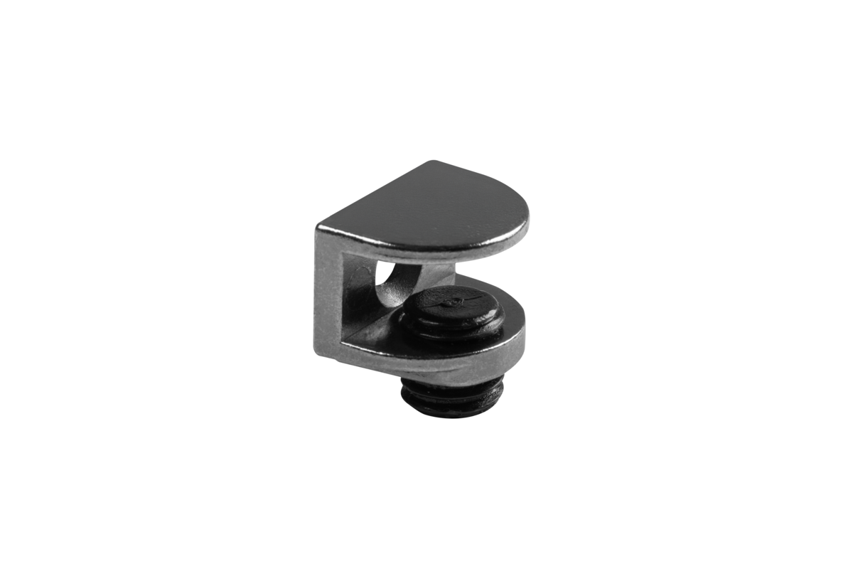Podpórka mocowana na wkręt, wykonana ze stopu ZnAl, w kolorze czarnym. Przeznaczona do montażu półek szklanych o grubości 4-8 mm.