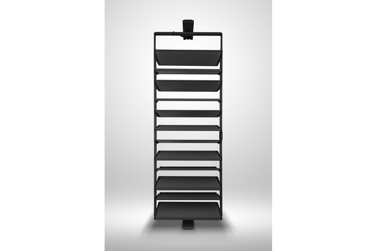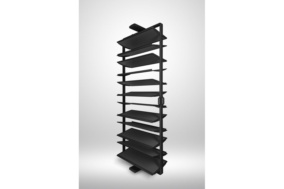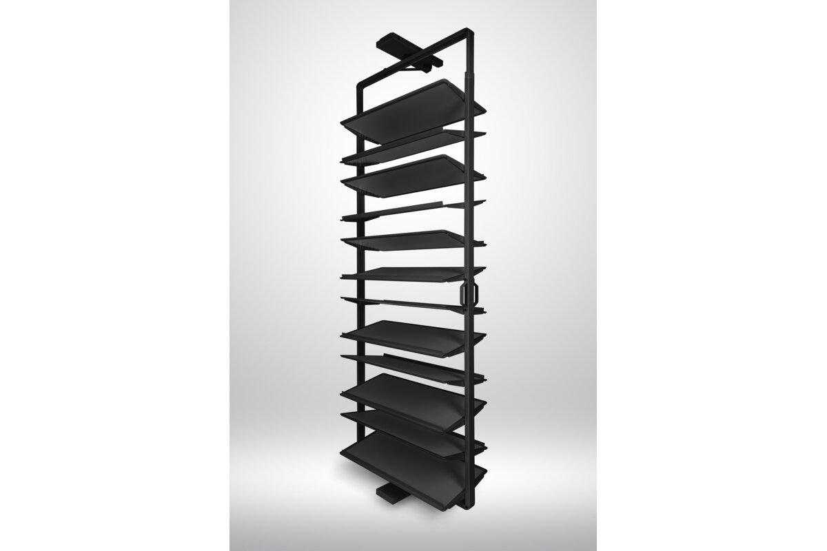 System obrotowy do butów przeznaczony do montażu wewnątrz szaf i garderób. Wyposażony w ergonomiczną rączkę umożliwiającą swobodny pochwyt i otwarcie oraz mechanizm obrotu o 180°, zapewniający pełny dostęp do zawartości. Konstrukcja oparta na stabilnej prowadnicy dolnego montażu, gwarantującej płynny i cichy ruch. Górna półka posiada funkcję regulacji wysokości, co pozwala na dostosowanie przestrzeni do różnych typów obuwia. Wykończenie powierzchni eko-skórą zapewnia estetyczny wygląd oraz ułatwia utrzymanie higieny.
