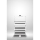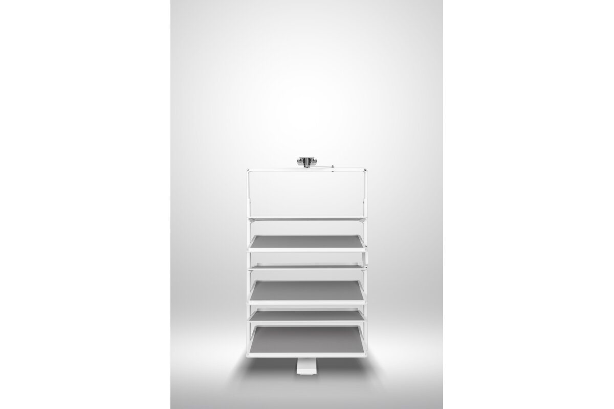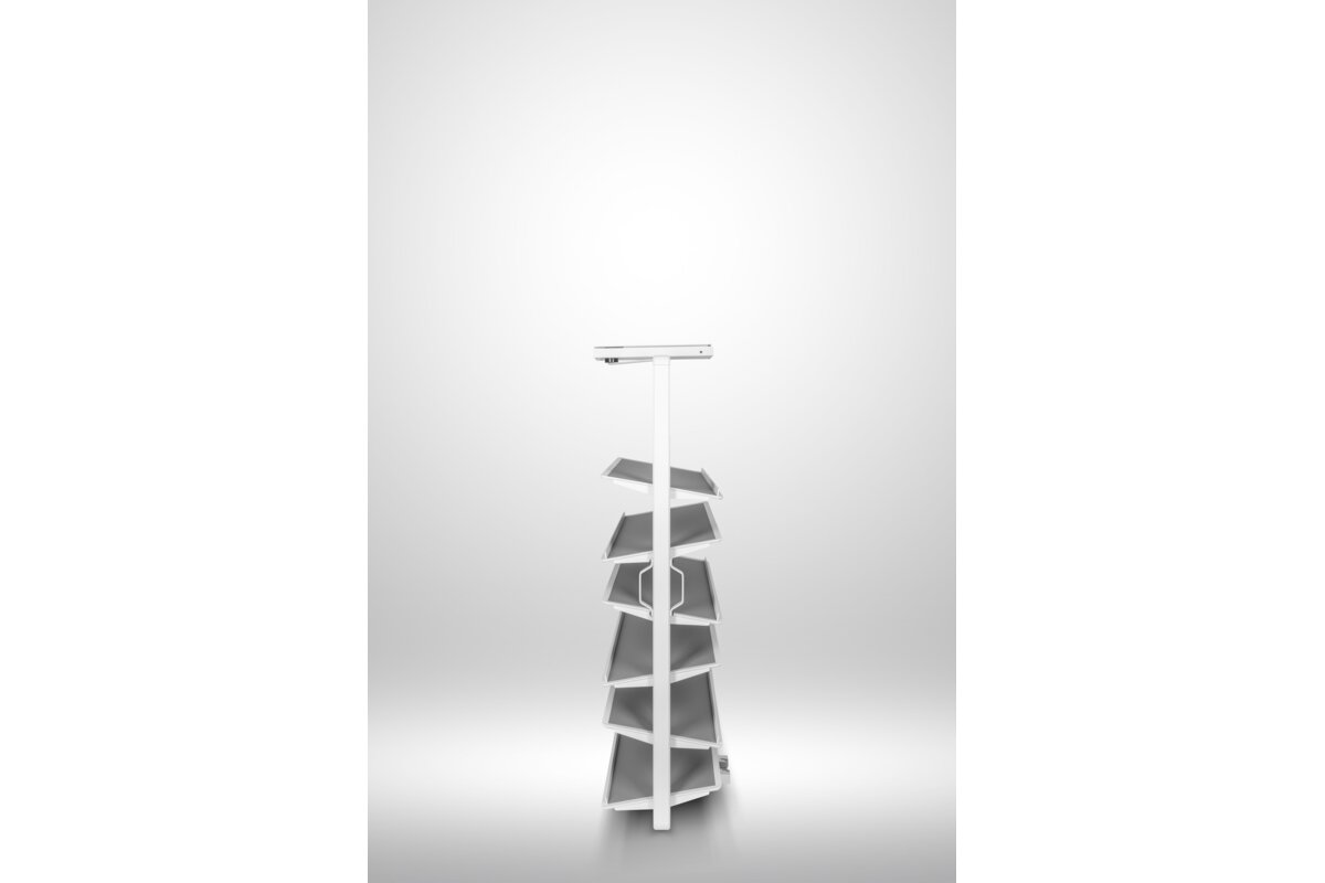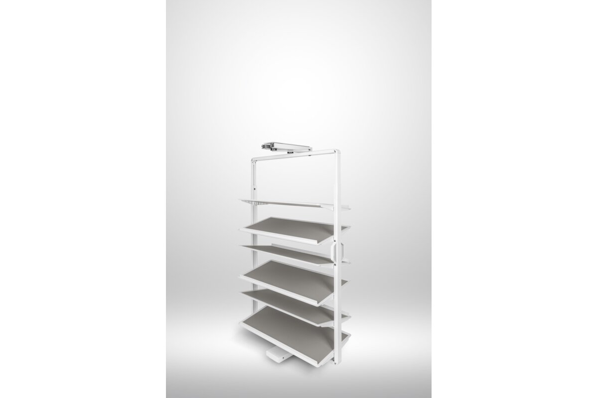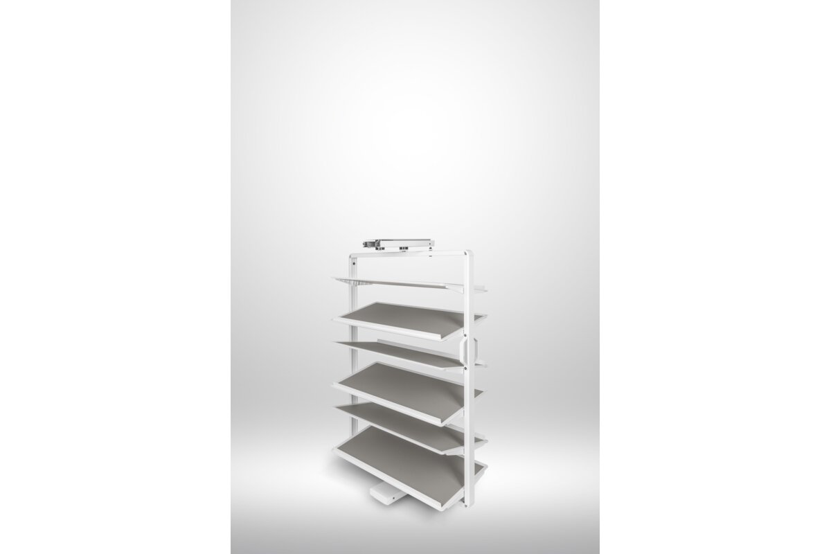 System obrotowy do butów przeznaczony do montażu wewnątrz szaf i garderób. Wyposażony w ergonomiczną rączkę umożliwiającą swobodny pochwyt i otwarcie oraz mechanizm obrotu o 180°, zapewniający pełny dostęp do zawartości. Konstrukcja oparta na stabilnej prowadnicy dolnego montażu, gwarantującej płynny i cichy ruch. Górna półka posiada funkcję regulacji wysokości, co pozwala na dostosowanie przestrzeni do różnych typów obuwia. Wykończenie powierzchni eko-skórą zapewnia estetyczny wygląd oraz ułatwia utrzymanie higieny.