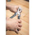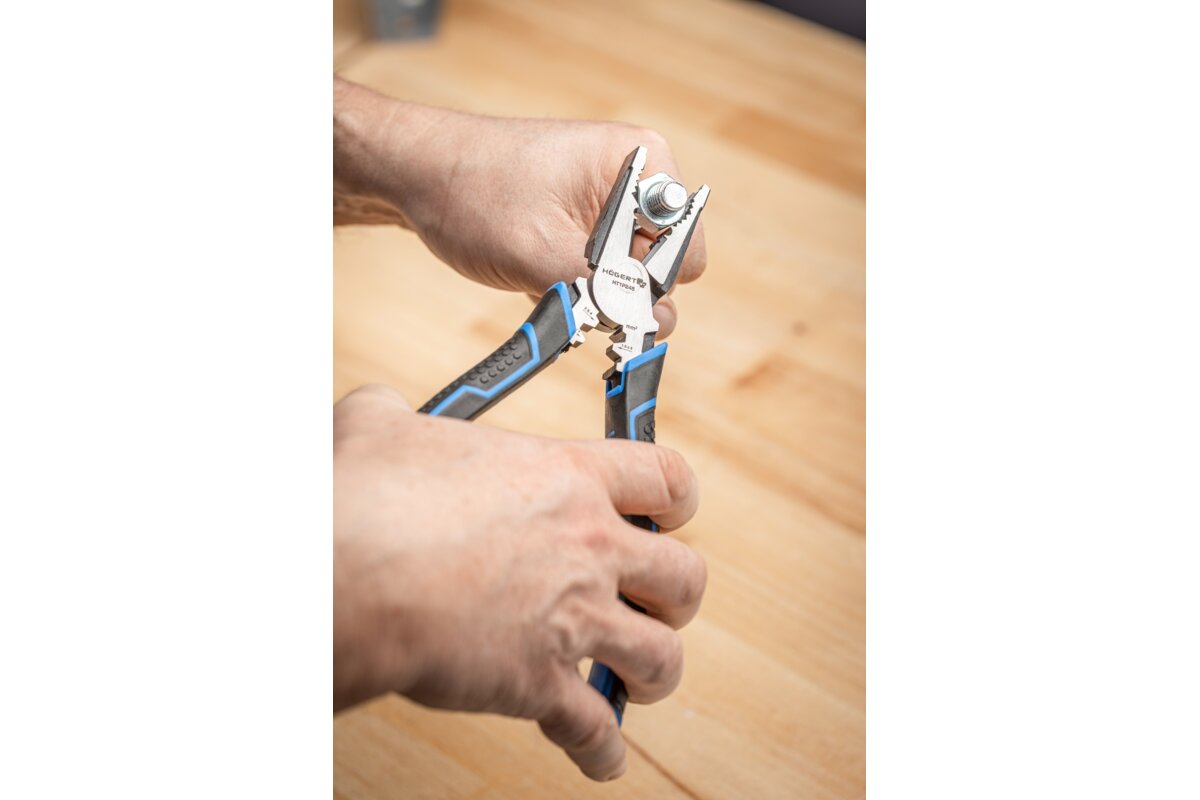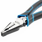 Uniwersalne narzędzie 10 w 1, łączące w sobie wiele funkcji użytkowych, pozwalających na wygodne i szybkie wykonywanie zróżnicowanych prac. Oszczędzasz miejsce na kilka narzędzi i obniżasz wagę torby narzędziowej. Precyzyjnie wyfrezowany tunel w przedniej części szczypiec, pozwala na uchwycenie niewielkich, w tym okrągłych łbów, śrub i wkrętów. Ponadto ułatwia pewne uchwycenie prętów, gwoździ, śrub w osi szczypiec, np. podczas szlifowania końcówek. Szeroka końcówka szczypiec umożliwia pewne zaciskanie miękkich materiałów, przytrzymywanie obiektów do średnicy 45 mm, ściskanie, zakręcanie, wyciąganie, chwytanie. Uchwyt do okrągłych elementów, dzięki asymetrycznym nacięciom, pozwala mocniej przytrzymać obiekt lub nakrętkę. Twarda gilotyna pozwala ciąć drut stalowy. Zaciskarka zapewnia trwałą obróbkę tulejowych końcówek przewodów elektrycznych 0,75-1,5 oraz 1,5-2,5 oraz 2,5- 4,0 mm². Otwór do ściągania izolacji, przyspiesza prace elektryczne. Tulejowa prasa pozwala przywrócić okrągły i prosty kształt prętom. Wysokiej jakości, równomiernie utwardzona stal chomowo-wanadowa umożliwia intensywne używanie szczypiec do wymagających dużej siły nacisku, ciężkich prac. Zawansowany proces indukcyjnej obróbki cieplnej daje narzędziu wysoką twardość zapobiegającą stępieniu ostrzy. Ich przemyślana geometria ułatwia cięcie. Dokładnie szlifowane, twarde powierzchnie robocze i zęby umożliwiają precyzyjną pracę. Ergonomiczne okładziny uchwytów, wykonane z odpornego na uszkodzenia, a zarazem miękkiego tworzywa TPU dają duży komfort podczas długiej pracy.