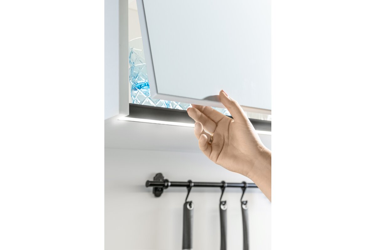 Profile wieńcowe stosowane są najczęściej w wiszących szafkach kuchennych i pełnią podwójną funkcję: oświetlają przestrzeń roboczą jednocześnie zastępując uchwyt do otwierania frontu. Takie rozwiązanie spotkać można w zabudowach opartych o systemy push to open.