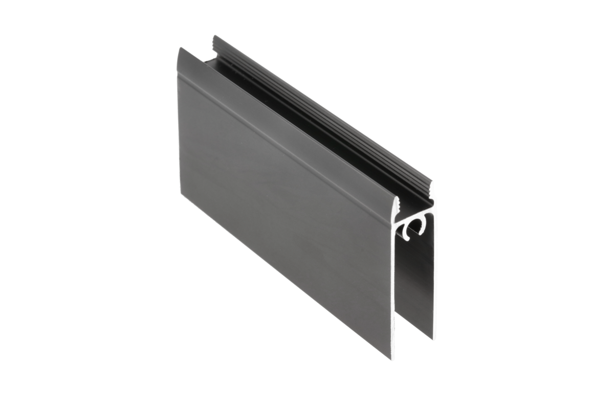 Dolna listwa pozioma, podobnie jak górna listwa pozioma, ma za zadanie nadać drzwiom korpusu sztywność. Tak samo utrzymuje dolny element wypełniający drzwi szafy równolegle do płaszczyzny podłogi. Oprócz połączenia dwóch pionowych rączek do drzwi korpusu, w profilu tym umieszcza się dolne wózki. Inną funkcją tego profilu jest funkcja dekoracyjna. Dzięki temu wózki mogą być ukryte, podobnie jak surowe krawędzie płyt wiórowych. Listwa, jako element składowy ramy drzwi, musi zostać trwale połączona z rączkami za pomocą blachowkrętów 6,3 x 40 mm. Można ją stosować do płyt o grubości 10 mm. A także z szkłem o grubości 4 mm wraz z uszczelką/klinem. Stosowana w systemach ramowych. W ten sposób zamyka się kontur przyszłych drzwi szafy. Dostępna w 4 wariantach kolorystycznych i 5 wariantach długości.