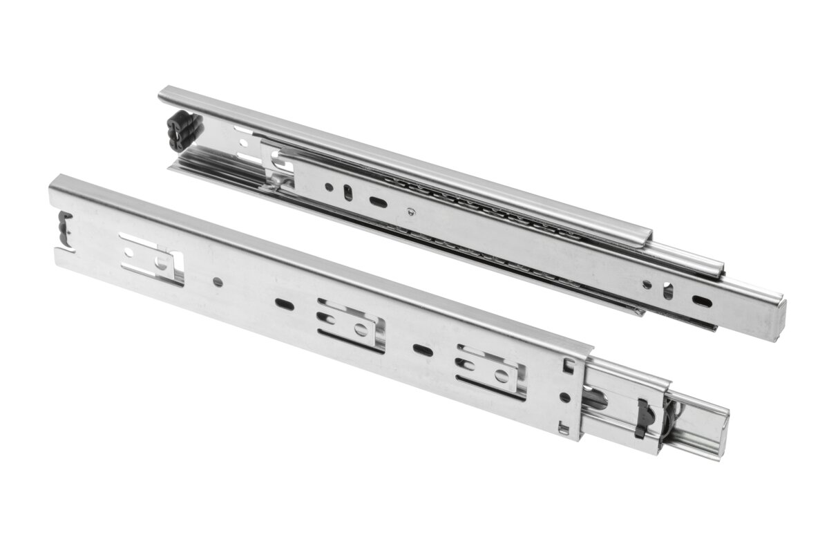 Uniwersalna, certyfikowana prowadnica kulkowa H45 PRESTIGE z samodociągiem pozwala na budowę szuflad standardowych i wewnętrznych. Pasuje do każdego typu szuflad – wąskich, szerokich, kuchennych, biurowych i warsztatowych. Należy pamiętać, że dla prawidłowego działania szuflady jej szerokość nie może przekraczać długości nominalnej prowadnicy. H45 PRESTIGE jest dostępna w wielu długościach. Wykonana ze stali pokrytej powłoką cynkową zabezpieczającą przed korozją, dostępna w 9 wariantach wymiarowych. Funkcja pełnego wysuwu umożliwia wygodny dostęp do najgłębszych miejsc. Prowadnica posiada również opcje wypięcia prowadnika z prowadnicy. Ponadto trwałość produktu jest certyfikowana na 60000 cykli oraz wytrzymuje obciążenie, aż do 35 kg.