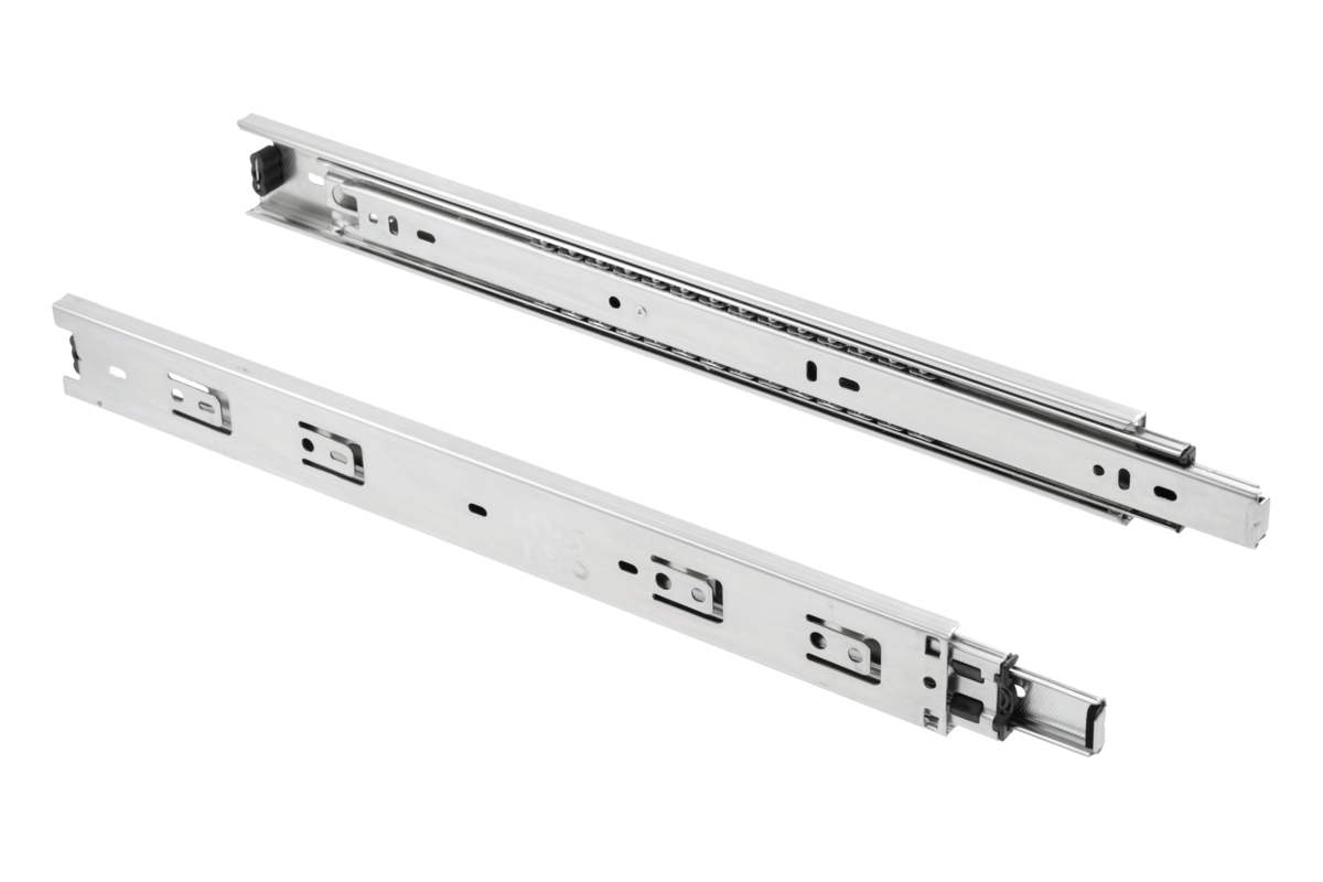 H45 PRO, wykonana jest w wysokiej jakości materiału, o grubości 1,2×1,2×1,5 mm. Posiada łożyska 3-kulowe. Jej mocną strona jest duży udźwig – do 50 kg, jest zatem odpowiednia do budowy szuflad przeznaczonych na ciężkie rzeczy. Z powodzeniem możemy zastosować ją w kuchni do przechowywania małego AGD, słoików, butelek i zapasów żywności. Sprawdzi się także do szuflad przeznaczonych na cięższe przedmioty, np. narzędzia warsztatowe. Możliwości aranżacyjne i duża wytrzymałość czynią z H45 Pro produkt dla wymagających. Prowadnica wyposażona jest w wysokiej jakości system zwiększający ergonomię – mechanizm pełnego wysuwu, który umożliwia całkowite wysunięcie szuflady, by swobodnie sięgnąć po głębiej schowane rzeczy. Wysokiej jakości materiały zapewniają wieloletnie, bezpieczne użytkowanie i odporność na uszkodzenia. Wykonana ze stali pokrytej powłoką cynkową zabezpieczającą przed korozją, dostępna w 9 wariantach wymiarowych. Produkt posiada również opcje wypięcia prowadnika z prowadnicy.