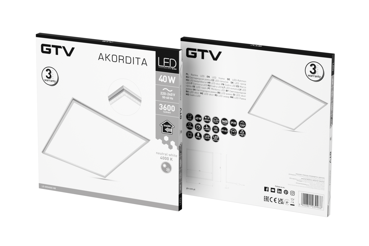 Ramka LED AKORDITA posiada klasę ochrony IP20, co czyni ją odpowiednią do stosowania w środowiskach suchych i wolnych od wody. Moc świetlna ramki wynosi 3600 lm, co gwarantuje jasne i efektywne oświetlenie pomieszczeń o różnym przeznaczeniu.