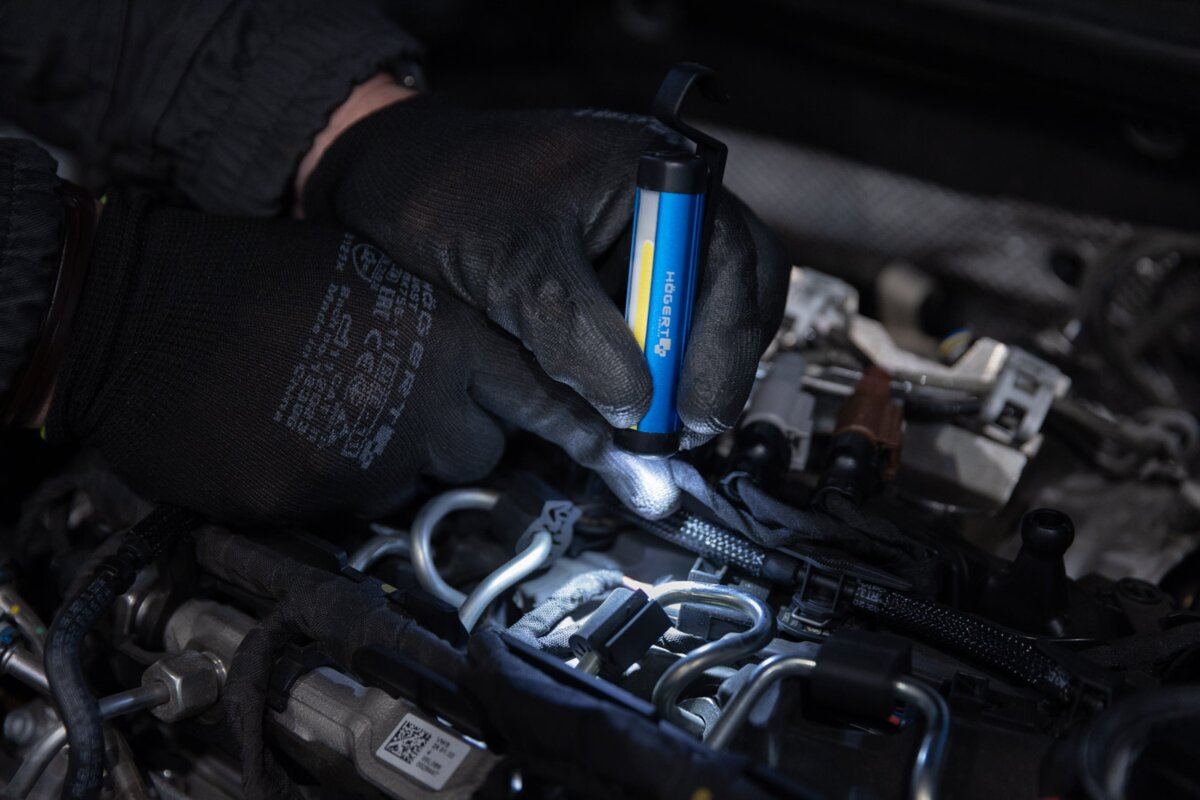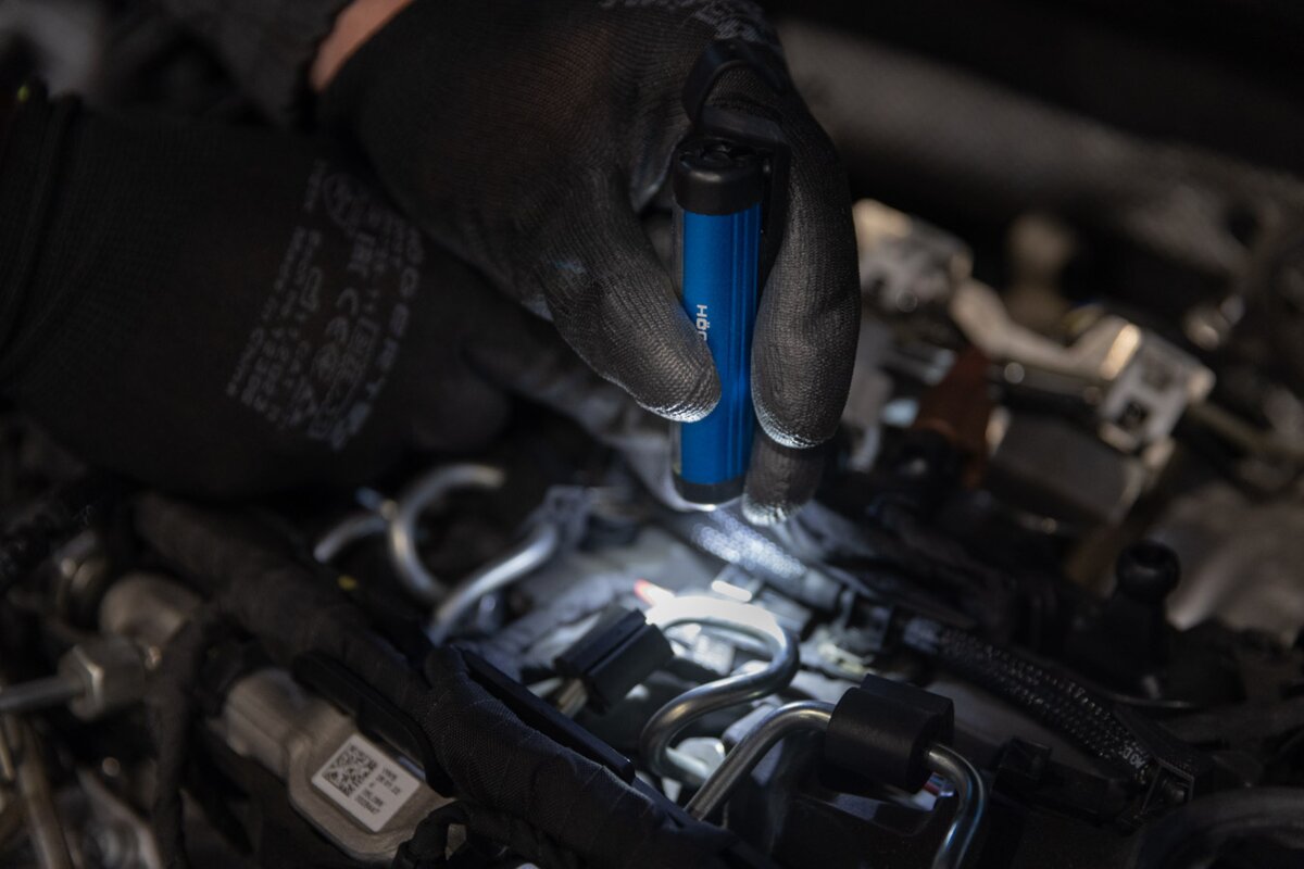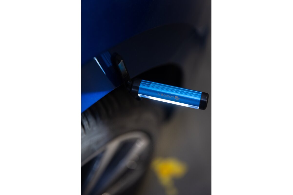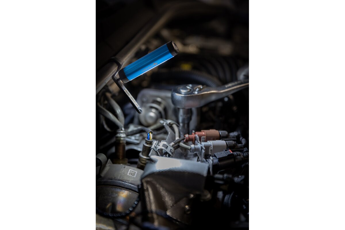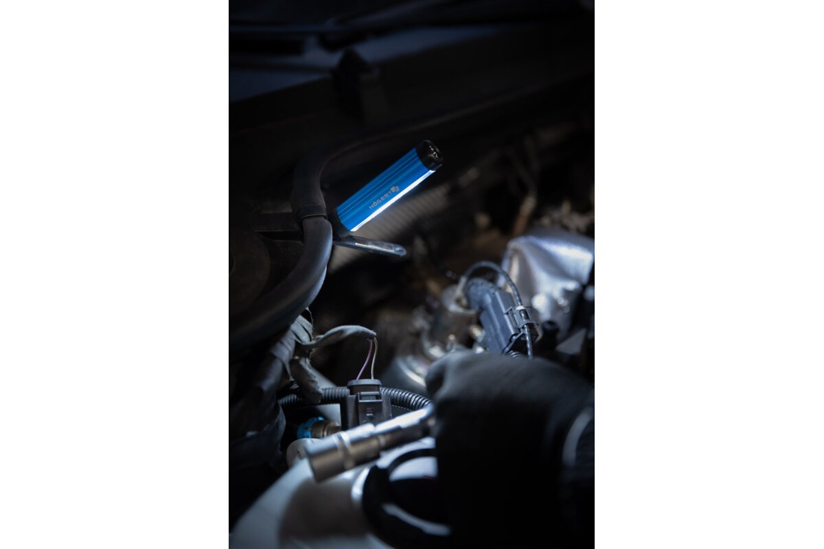 Mocny magnes umożliwia zamocowanie reflektora na dowolnej metalowej powierzchni, co pozwala na swobodne używanie obu rąk podczas pracy.
