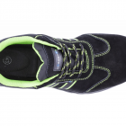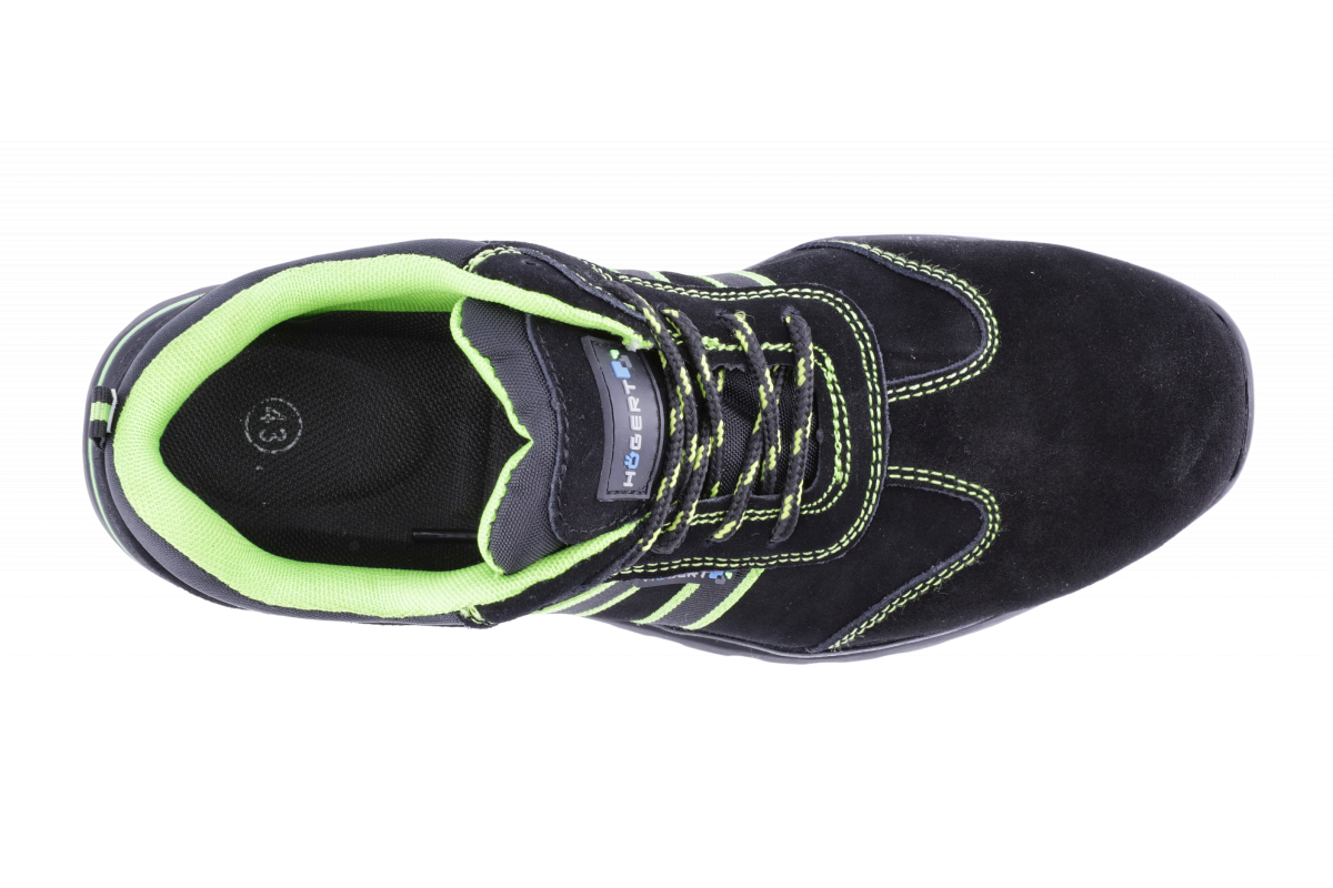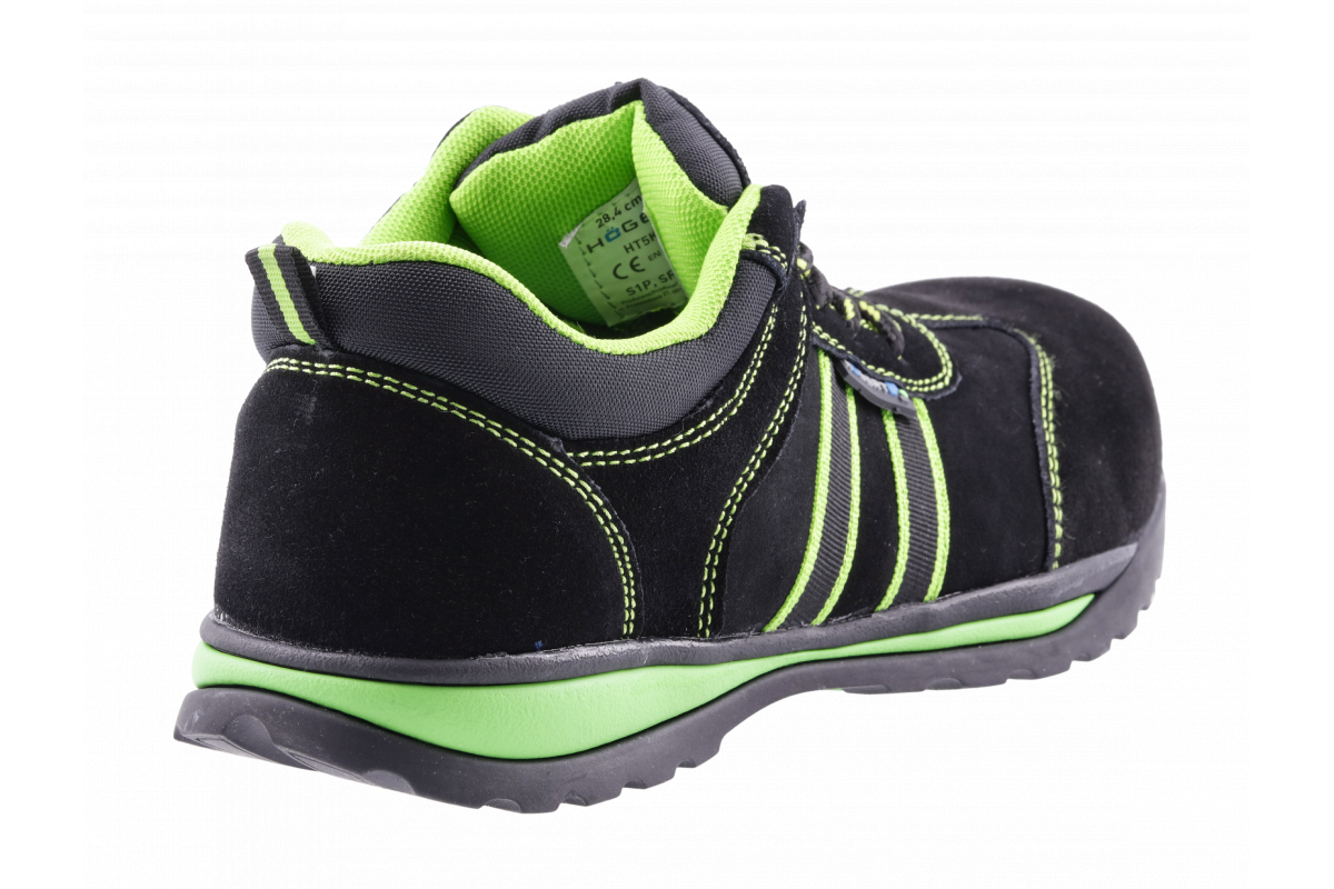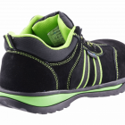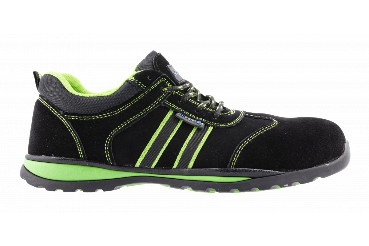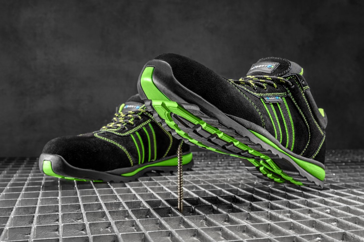 Męskie półbuty ochronne zgodne z klasą bezpieczeństwa S1P według normy ISO 20345:2011. Obuwie wykonane z nubuku sprzyja wygodzie i komfortowi użytkowania. Modny i uniwersalny czarny kolor z zielonymi akcentami pasuje do wielu stylizacji. Buty wyposażono w kompozytowy podnosek. Dzięki antypoślizgowej podeszwie (właściwości antypoślizgowe kategoria SRA) buty doskonale sprawdzą się podczas chodzenia po nierównych i śliskich podłożach. Buty polecane w branży logistycznej, transportowej, w przemyśle samochodowym, w pracach remontowych oraz budowlanych. Świetnie sprawdzą się w zamkniętych pomieszczeniach (np. halach).