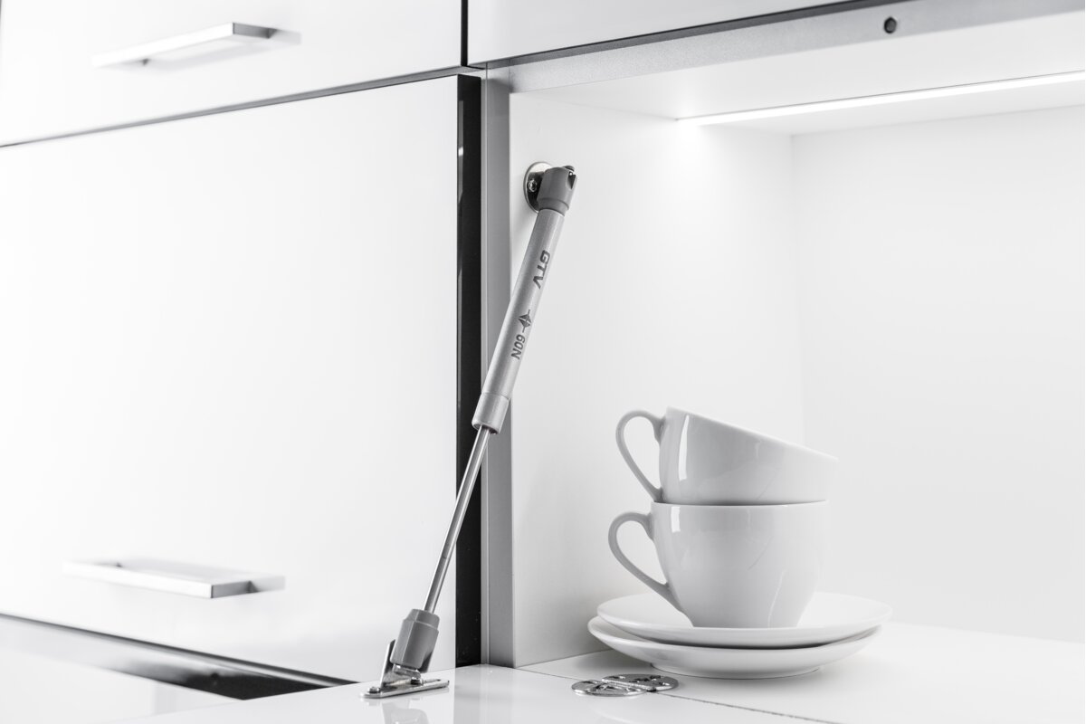 Podnośnik olejowy umożliwia zaprojektowanie funkcjonalnych oraz nowoczesnych szafek górnych. Zapewnia płynność oraz amortyzację przy otwieraniu szafek. Jego mechanizm zapobiega bezwładnemu opadnięciu frontu. Wykonany ze stali w kolorze szarym, znajdzie swoje zastosowanie w klapach barkowych o wysokości frontu do 600 mm. Orientacyjny kąt otwarcia podnośnika wynosi 90° w zależności od użytego zawiasu. Może być stosowany zarówno do frontów pełnych jak i wykonanych z profili aluminiowych. Dostępne 3 warianty siły produktu: 60, 80, 150 N. Podczas montażu wymaga zastosowania zawiasów.