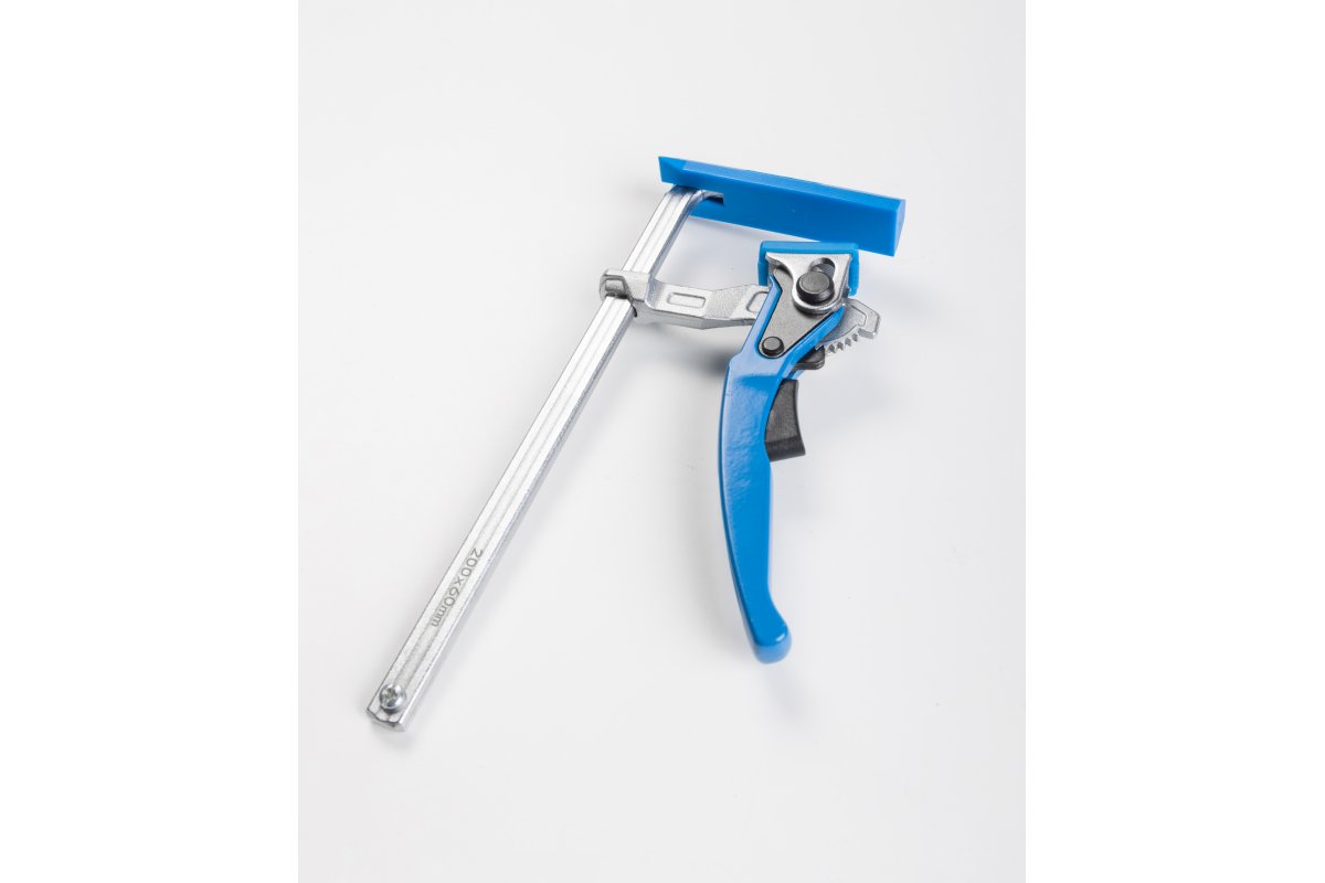 Ścisk dźwigniowy umożliwiający szybkie, punktowe mocowanie. Idealnie nadaje się do sklejania i mocowania różnego rodzaju materiałów czy elementów, np. w pracach stolarskich, ślusarskich oraz modelarskich. Wysoka siła docisku pozwala wyeliminować drgania podczas pracy. Doskonale pasuje do mocowania szyn prowadzących Festool, Makita, Metabo czy Milwaukee.