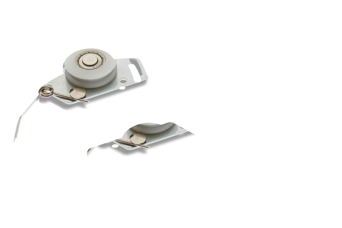 Dwa wózki górne ze sprężynami: wózki te przeznaczone są do montażu na górze frontów szaf i odpowiadają za prowadzenie drzwi podczas ich otwierania i zamykania. Sprężyny zapewniają dodatkowe napięcie, dzięki czemu front jest bezpiecznie utrzymywany na miejscu. Jeśli tory, górny i dolny, nie są względem siebie równoległe, tj. wysokość zabudowy po lewej stronie różni się od wysokości po prawej, to zadaniem tej sprężyny jest skompensować tę różnicę.