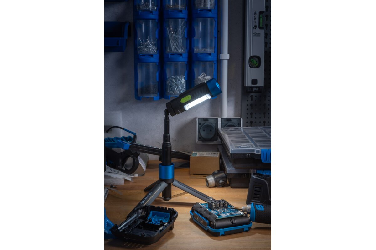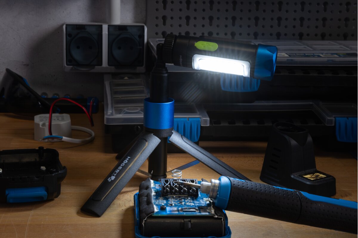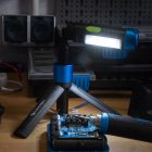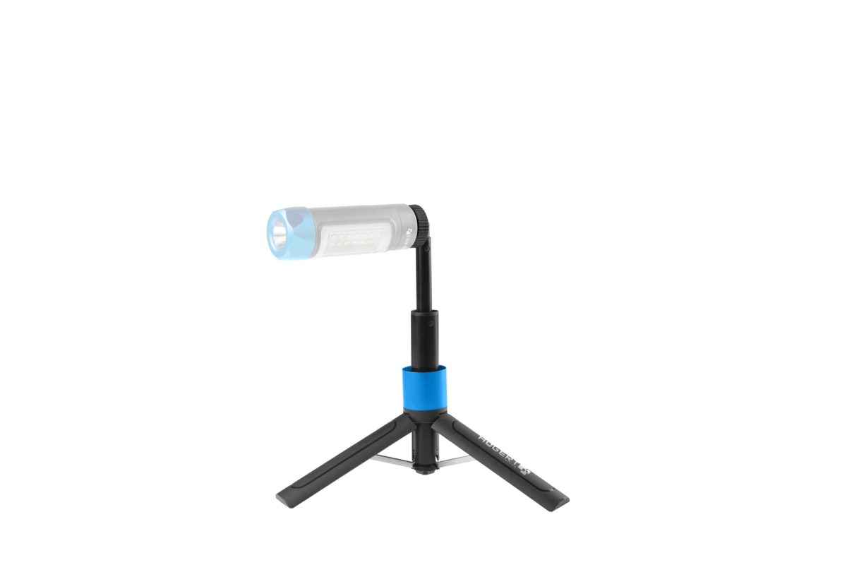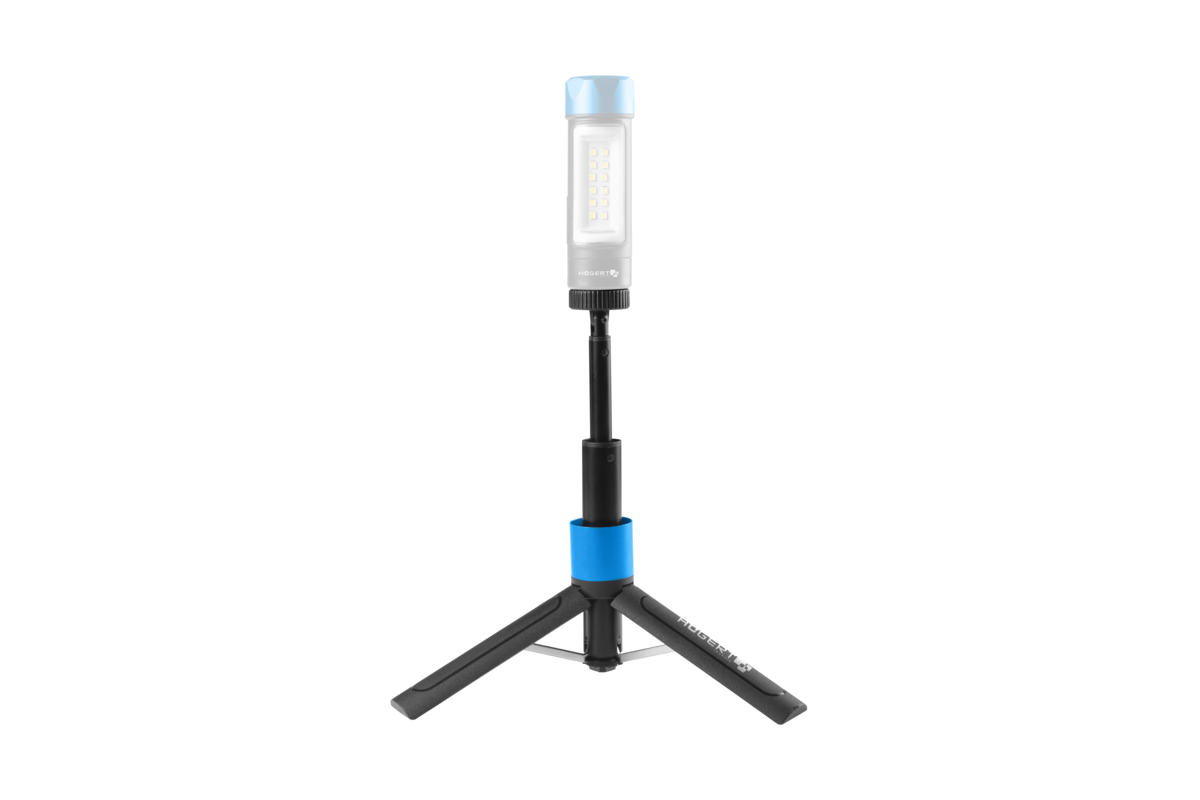 Złożony statyw wraz z zamontowanym reflektorem HT1E436, tworzy jednolity walec latarki.