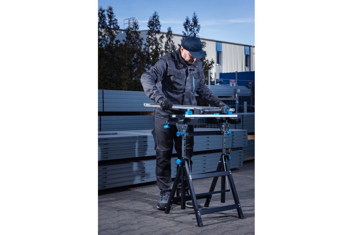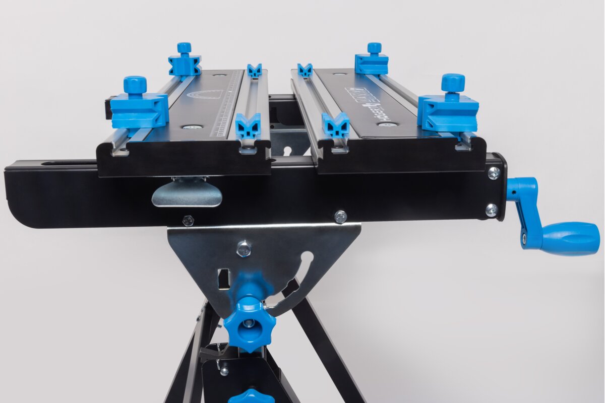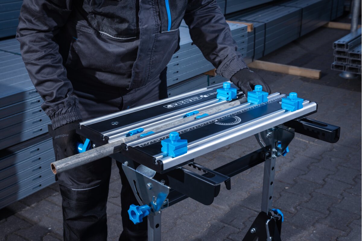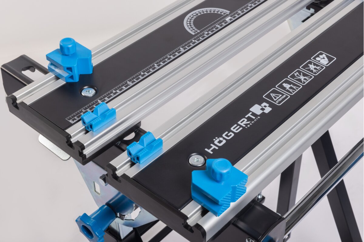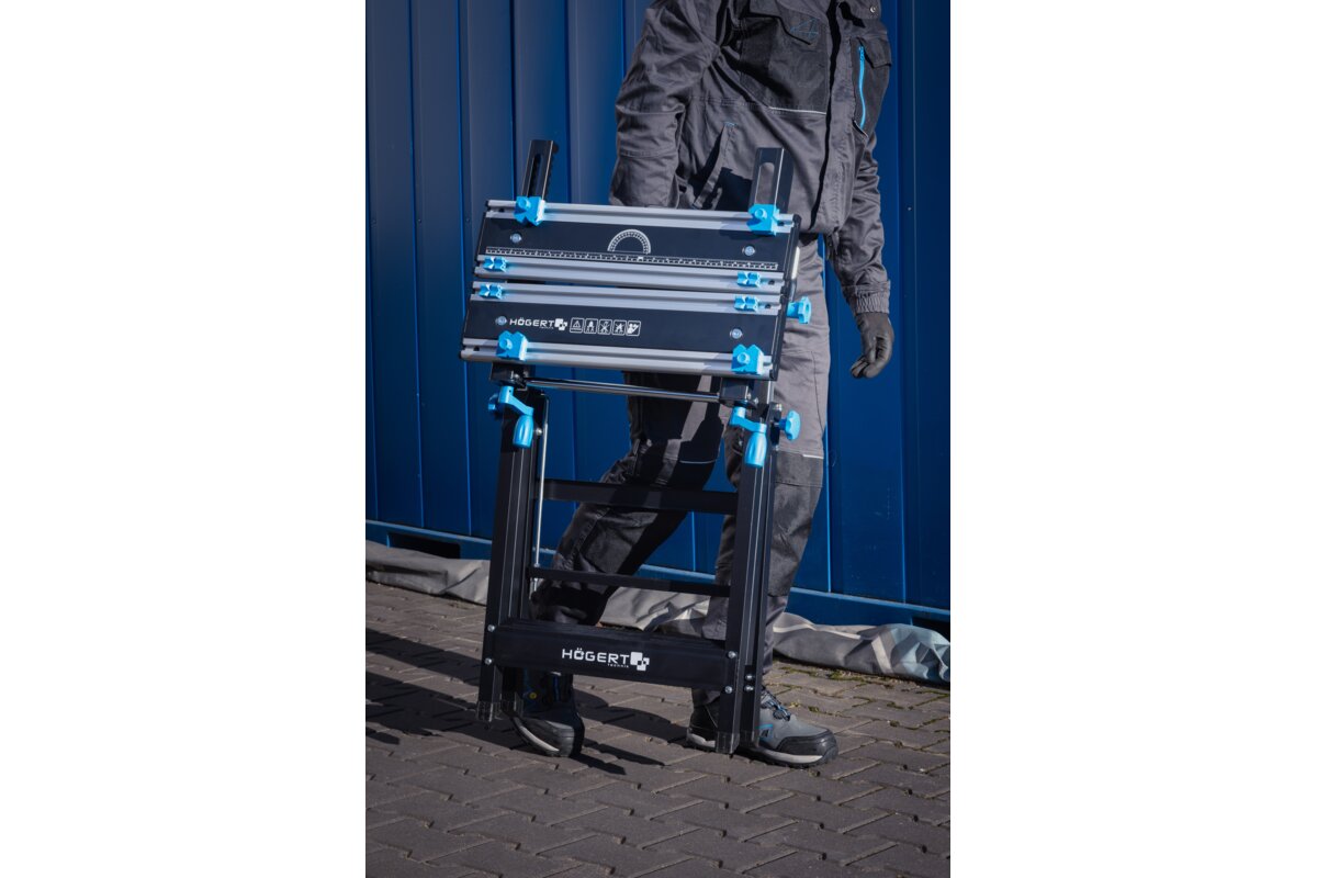 Wytrzymała stal oraz odporne i lekkie aluminium, użyte w blacie i konstrukcji stołu, gwarantują odporność i trwałość narzędzia.