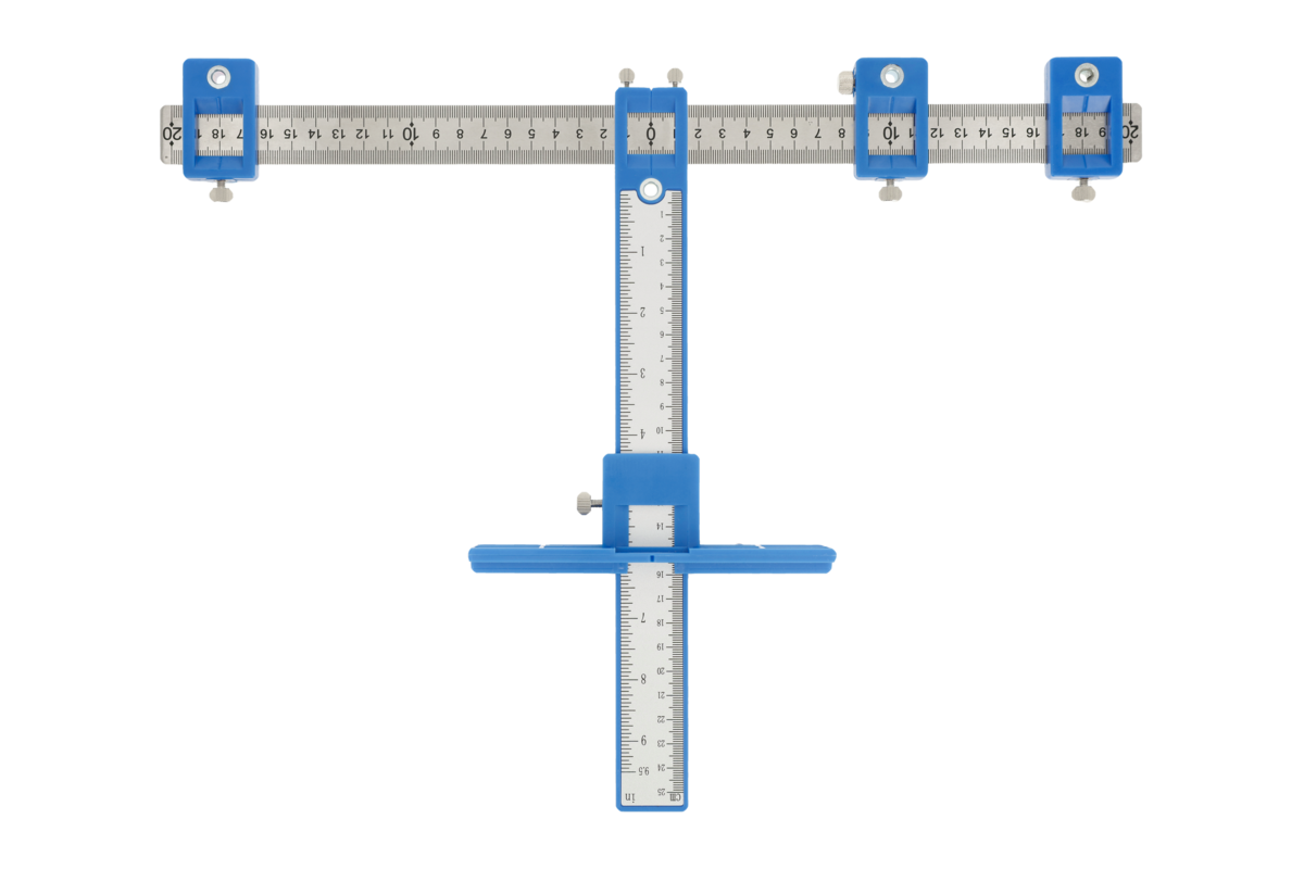 W górnej części narzędzia umieszczona jest ruchoma, stalowa listwa na której umieszczono trzy przesuwane znaczniki służące do dokładanego wyznaczenia punktów wiercenia.