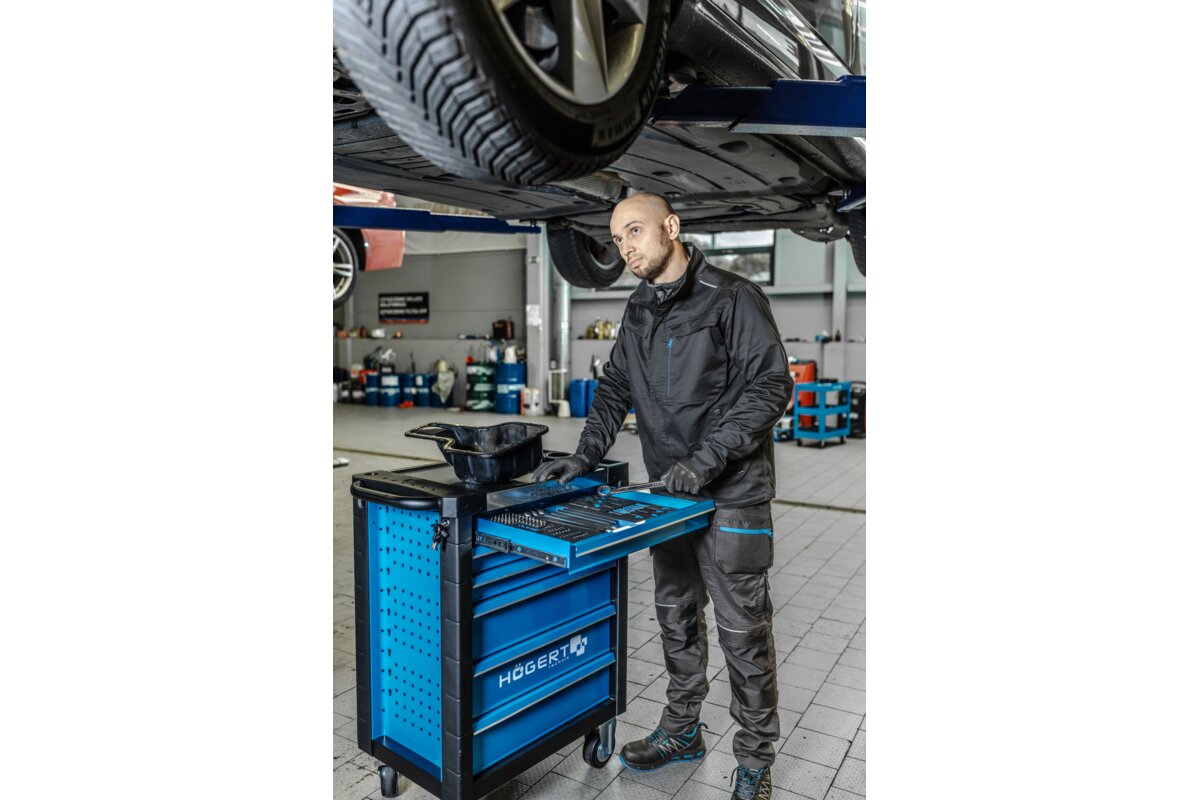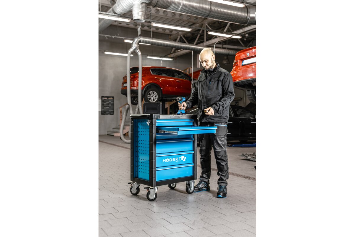 Praktyczna szafka narzędziowa z 6 szufladami do przechowywania narzędzi i akcesoriów. Znajdzie zastosowanie w warsztacie samochodowym lub w garażu każdego majsterkowicza. Szafka ma nowoczesny wygląd, który doskonale komponuje się z różnymi wnętrzami warsztatowymi lub garażowymi. Podkreśla także profesjonalny charakter miejsca pracy. Wykonana została z wytrzymałych materiałów, co gwarantuje jej długą żywotność i odporność na uszkodzenia. Stabilna konstrukcja zapewnia bezpieczne przechowywanie wartościowych narzędzi. Szafka wyposażona jest w 2 stałe i 2 skrętne koła wykonane z trwałego materiału TPR. Pozwala to na łatwe przemieszczanie szafki po warsztacie lub garażu, nawet przy dużym obciążeniu.