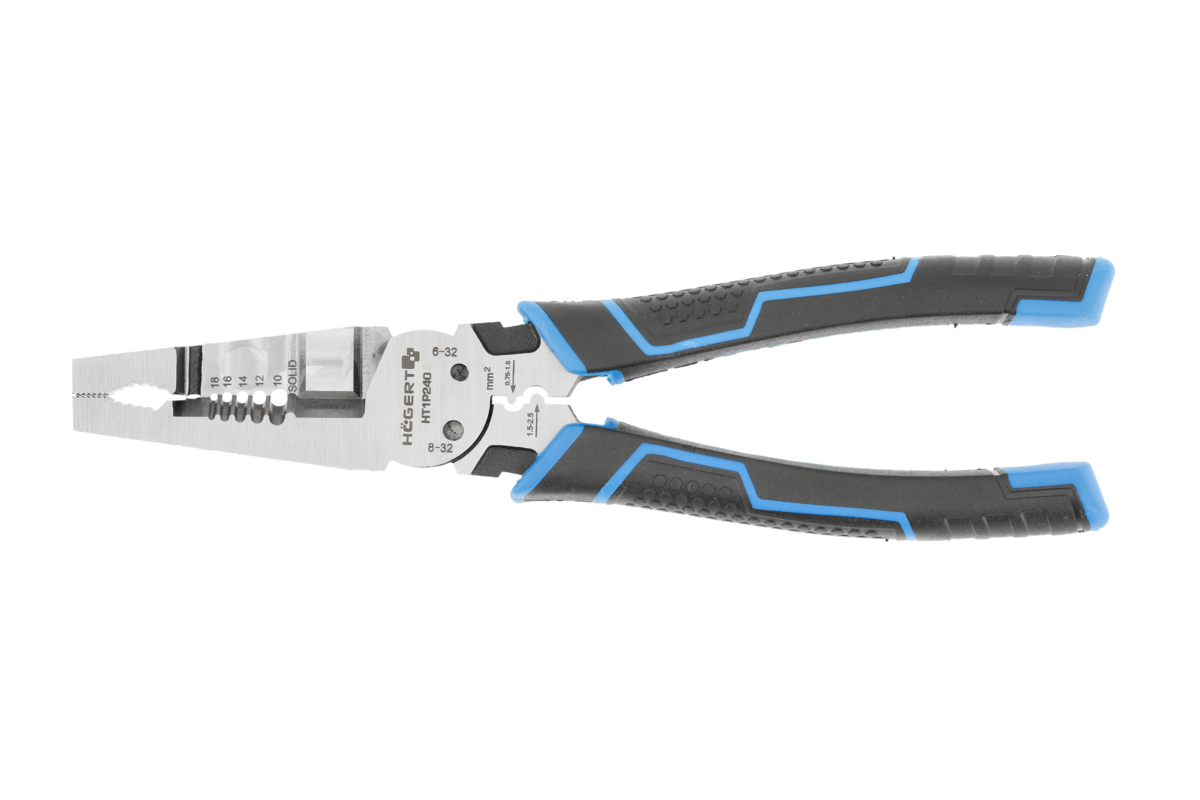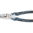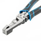 Uniwersalne narzędzie 9 w 1, łączące w sobie wiele funkcji użytkowych, pozwalających na wygodne i szybkie wykonywanie zróżnicowanych prac. Oszczędzasz miejsce na kilka narzędzi i obniżasz wagę torby narzędziowej. Frezowana końcówka szczypiec umożliwia zaciskanie miękkich materiałów, przytrzymywanie obiektów do średnicy 35 mm, ściskanie, zakręcanie, wyciąganie, chwytanie. Uchwyt do okrągłych elementów, dzięki asymetrycznym nacięciom, pozwala mocniej przytrzymać obiekt lub nakrętkę. Ściągacz izolacji przewodów elektrycznych dzięki precyzyjnie wyciętym ostrzom, nie uszkadza rdzenia. Twarda gilotyna pozwala ciąć drut stalowy. Obcinarka pozwala skracać nity o rozmiarach 6-32 oraz 8-32. Zaciskarka zapewnia trwałą obróbkę tulejowych końcówek przewodów elektrycznych 0,75-1,5 oraz 1,5-2,5 mm². Wysokiej jakości, równomiernie utwardzona stal chomowo-wanadowa umożliwia intensywne używanie szczypiec do wymagających dużej siły nacisku, ciężkich prac. Zawansowany proces indukcyjnej obróbki cieplnej daje narzędziu wysoką twardość zapobiegającą stępieniu ostrzy. Ich przemyślania geometria ułatwia cięcie. Dokładnie szlifowane, twarde powierzchnie robocze i zęby umożliwiają precyzyjną pracę. Ergonomiczne okładziny uchwytów, wykonane z odpornego na uszkodzenia, a zarazem miękkiego tworzywa TPU, dają duży komfort podczas długiej pracy.