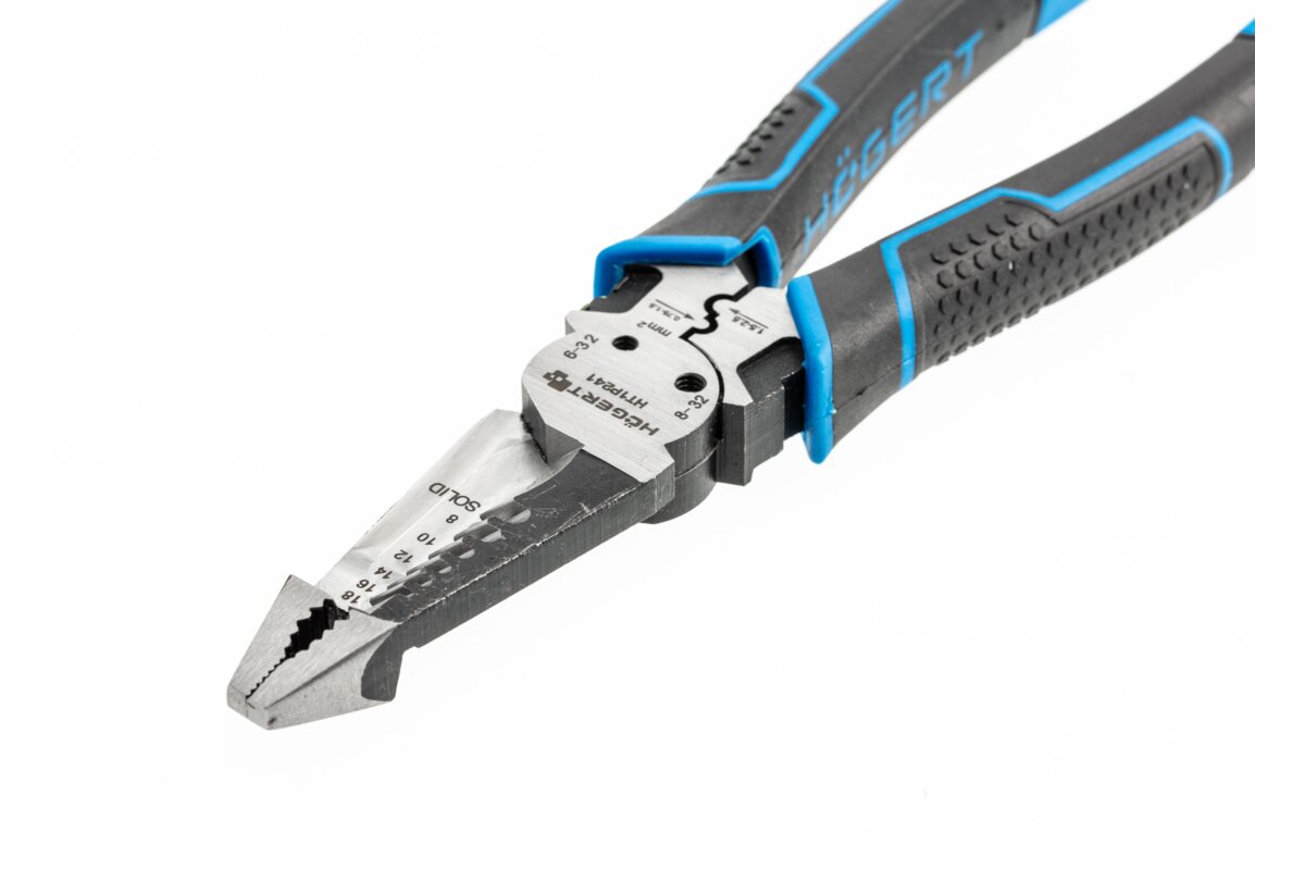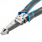 Uniwersalne narzędzie 10 w 1, łączące w sobie wiele funkcji użytkowych, pozwalających na wygodne i szybkie wykonywanie zróżnicowanych prac. Frezowana końcówka szczypiec umożliwia zaciskanie miękkich materiałów, przytrzymywanie obiektów do średnicy 50 mm, ściskanie, zakręcanie, wyciąganie, chwytanie. Dodatkowo ich zaokrąglony kształt, pozwala zawijać oczka. Uchwyt do okrągłych elementów, dzięki asymetrycznym nacięciom, pozwala mocniej przytrzymać obiekt lub nakrętkę. Ściągacz izolacji przewodów elektrycznych dzięki precyzyjnie wyciętym ostrzom, nie uszkadza rdzenia. Twarde ostrze pozwala łatwo ciąć kable. Obcinarka pozwala skracać nity o rozmiarach 6-32 oraz 8-32. Zaciskarka zapewnia trwałą obróbkę tulejowych końcówek przewodów elektrycznych 0,75-1,5 oraz 1,5-2,5 mm². Wysokiej jakości, równomiernie utwardzona stal chomowo-wanadowa umożliwia intensywne używanie szczypiec do wymagających dużej siły nacisku, ciężkich prac. Zawansowany proces indukcyjnej obróbki cieplnej daje narzędziu wysoką twardość zapobiegającą stępieniu ostrzy. Ich przemyślana geometria ułatwia cięcie. Dokładnie szlifowane, twarde powierzchnie robocze i zęby umożliwiają precyzyjną pracę. Ergonomiczne okładziny uchwytów, wykonane z odpornego na uszkodzenia, a zarazem miękkiego tworzywa TPU dają duży komfort podczas długiej pracy.