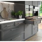 Szuflada Axis Pro charakteryzuje się wysoką trwałością certyfikowaną na 60 000 cykli. Zapewnia pełny wysuw w długościach od 250 do 600 mm, a mechanizm cichego domyku gwarantuje cichą pracę i delikatne zamykanie szuflady. 5 wariantów wysokości sprawi, że idealnie dopasujesz ją do swojej kuchni, a bok szuflady o szerokości tylko 14 mm umożliwia maksymalne wykorzystanie wewnętrznej przestrzeni mebla. Obciążenie szuflady pozwala na umieszczenie w niej aż 40 kg różnych produktów. Montaż jest łatwy dzięki komfortowej regulacji od wewnętrznej strony, regulacji pochylenia oraz regulacji poziomej w zakresie +- 2 mm. Do szuflady pasuje cała gama systemów organizacji przestrzeni, wkładów na sztućce, mat oraz sortowników na odpady.