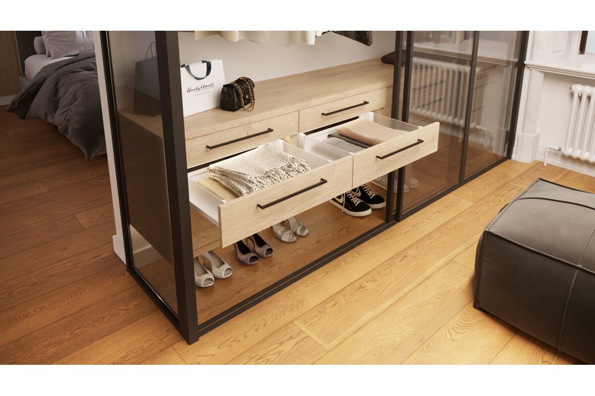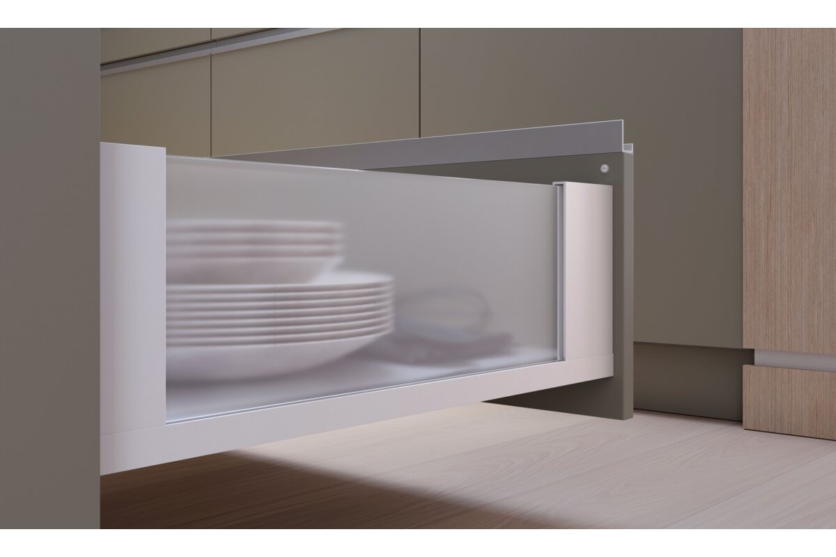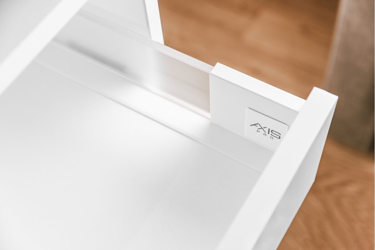 Szuflada AXIS PRO ze szklanymi bokami charakteryzuje się wysoką trwałością certyfikowaną na 60 000 cykli. Zapewnia pełny wysuw w długościach od 300 do 550 mm, a mechanizm cichego domyku gwarantuje cichą pracę i płynne zamykanie szuflady. 3 warianty wysokości sprawią, że idealnie dopasujesz ją do swoich wnętrz. Szklane boki szuflad AXIS PRO to szkło hartowane, odporne na uszkodzenia i łatwe do czyszczenia. Bok szuflady o szerokości tylko 14 mm umożliwia maksymalne wykorzystanie wewnętrznej przestrzeni mebla. Obciążenie szuflady pozwala na umieszczenie w niej aż 40 kg różnych produktów. Szuflady AXIS PRO ze szklanymi bokami bazują na prowadnicach AXIS PRO z cichym domykiem. Montaż jest łatwy dzięki komfortowej regulacji od wewnętrznej strony, regulacji pochylenia oraz regulacji poziomej w zakresie +- 2 mm. Do szuflady pasuje cała gama systemów organizacji przestrzeni, wkładów na sztućce, mat oraz sortowników na odpady.