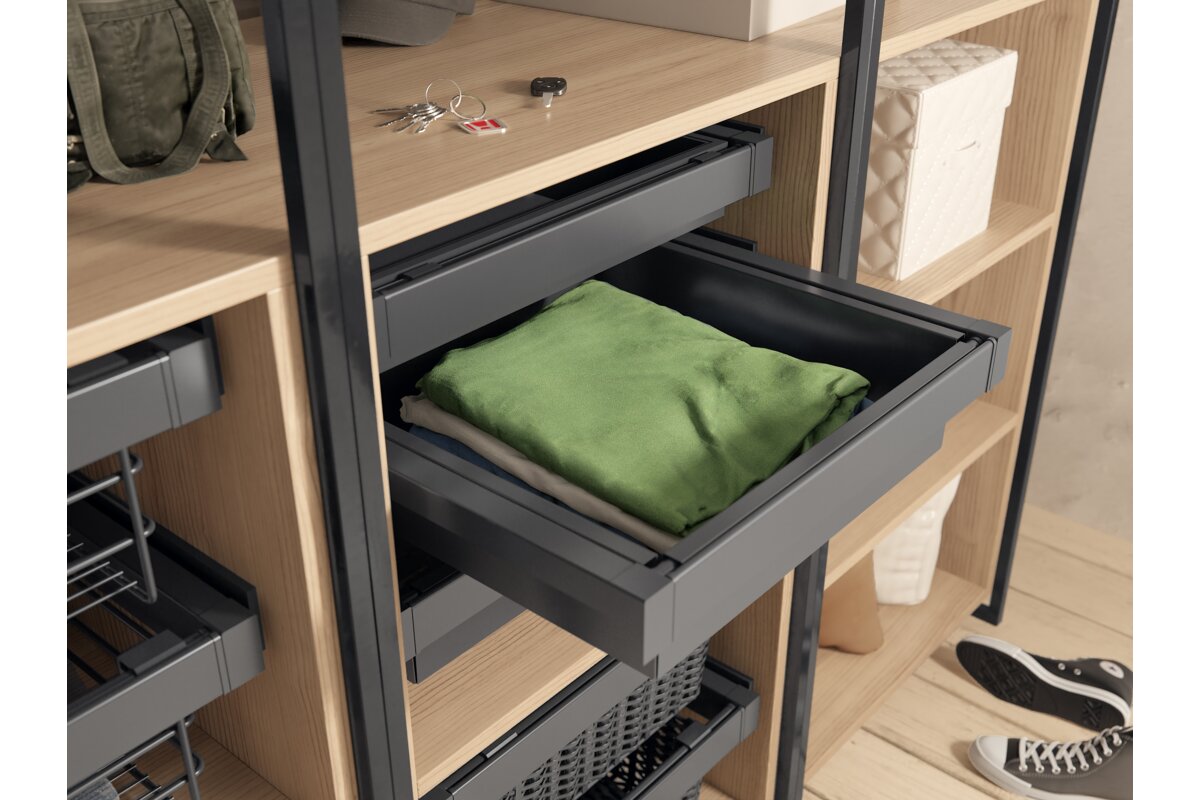Szuflada metalowa z linii ELITE to funkcjonalne rozwiązanie do każdej garderoby. W łatwy i szybki sposób pozwoli na uporządkowanie miejsca w szafie. Dzięki niej przechowywane przedmioty są bezpieczne i łatwo dostępne. Kosz metalowy ELITE dostępny jest w dwóch wariantach kolorystycznych oraz czterech wariantach rozmiarowych z możliwością dostosowania szerokości do korpusu. Technologia cichego domyku oraz pełny wysuw ułatwia codzienne użytkowanie kosza. Zestaw jest wyposażony w dwie sztuki prowadnic dolnego montażu, dwie sztuki osłon prowadnicy, dwie sztuki mocowania kosza, ramę z regulacją szerokości +/- 58 mm, kosz metalowy oraz wkręty.