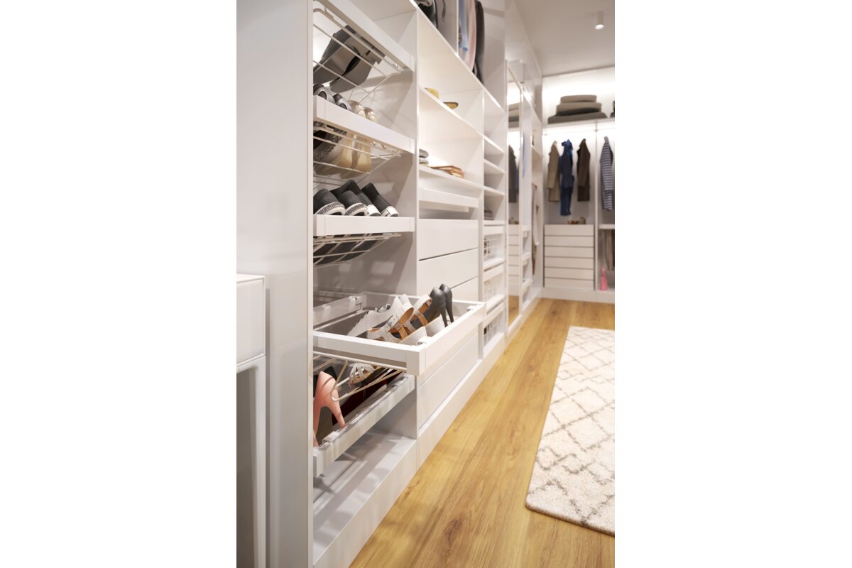 Szuflada ażurowa ELITE na obuwie sprawdzi się zarówno w szafie wolnostojącej jak i większej garderobie. Pozwala zachować ład w mieszkaniu oraz buty w doskonałym stanie. Szuflada dostępna jest w dwóch wariantach kolorystycznych oraz czterech wariantach rozmiarowych z możliwością dostosowania szerokości do korpusu. Technologia cichego domyku oraz pełny wysuw ułatwia codzienne użytkowanie szuflady. Zestaw jest wyposażony w dwie sztuki prowadnic dolnego montażu, dwie sztuki osłon prowadnicy, dwie sztuki mocowania kosza, ramę z regulacją szerokości +/- 58 mm, kosz druciany, ażurowy oraz wkręty.