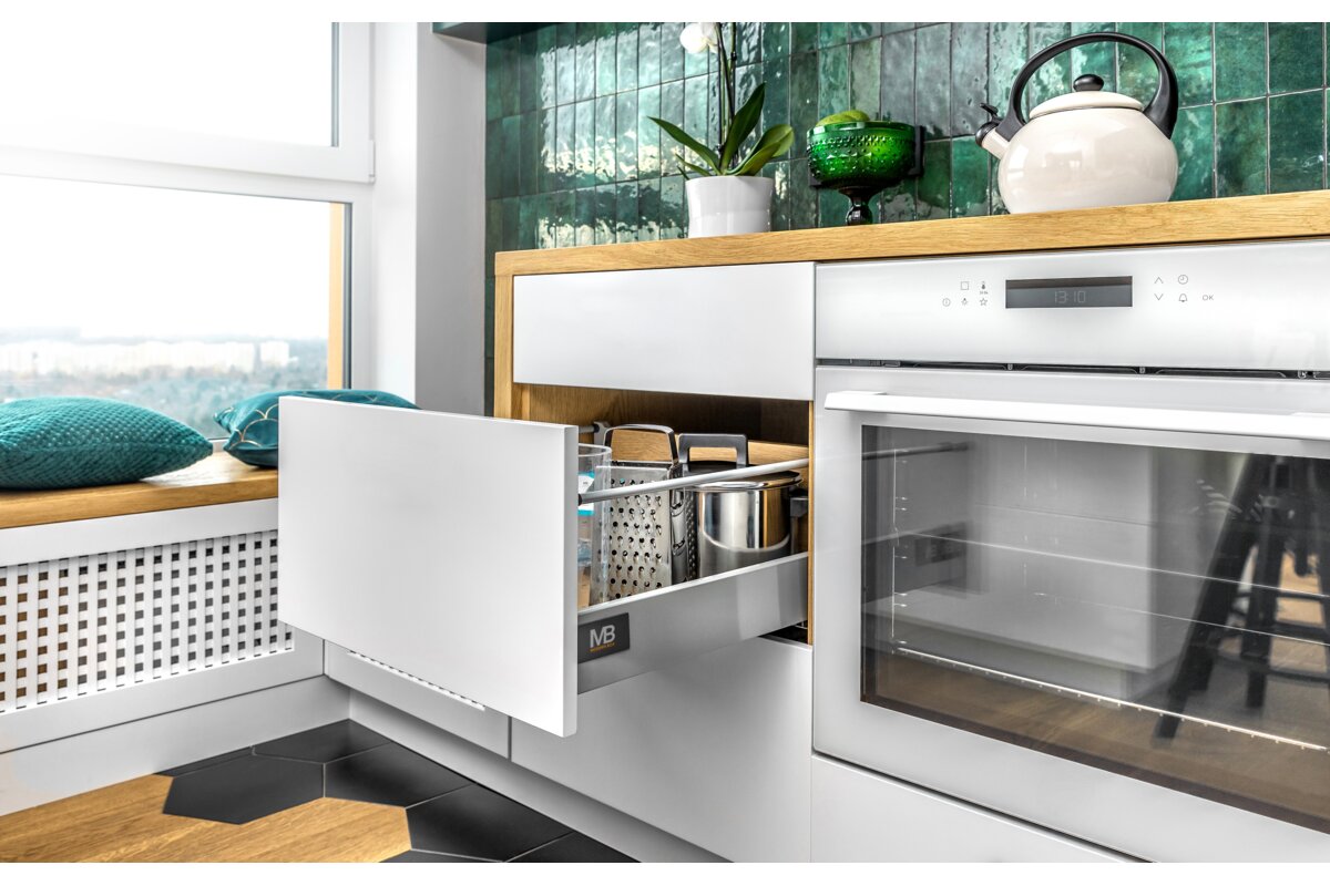 Szuflada Modern Box charakteryzuje się wysoką trwałością, certyfikowaną na 60 000 cykli (SGS). Zapewnia obciążenie do 40 kg oraz pełny wysuw w długościach między 250 a 550 mm. Występuje w 3 wariantach wysokości (83, 146, 210 mm) dla szuflad uniwersalnych, zarówno z frontem wpuszczanym, jak i nakładanym. Komfort pracy zapewnia synchronizacja toru pracy prowadnic. Szuflady wyposażone w mechanizm push to open – otwierają się po lekkim naciśnięciu frontu w odpowiednim miejscu, gwarantując natychmiastowy dostęp do zawartości. Do szuflady pasuje cała gama systemów organizacji przestrzeni, wkładów na sztućce, mat oraz sortowników na odpady.