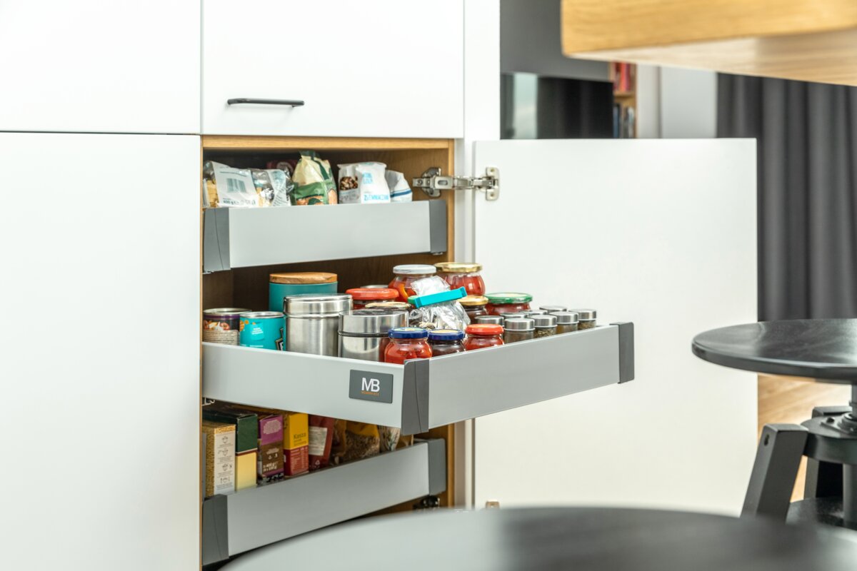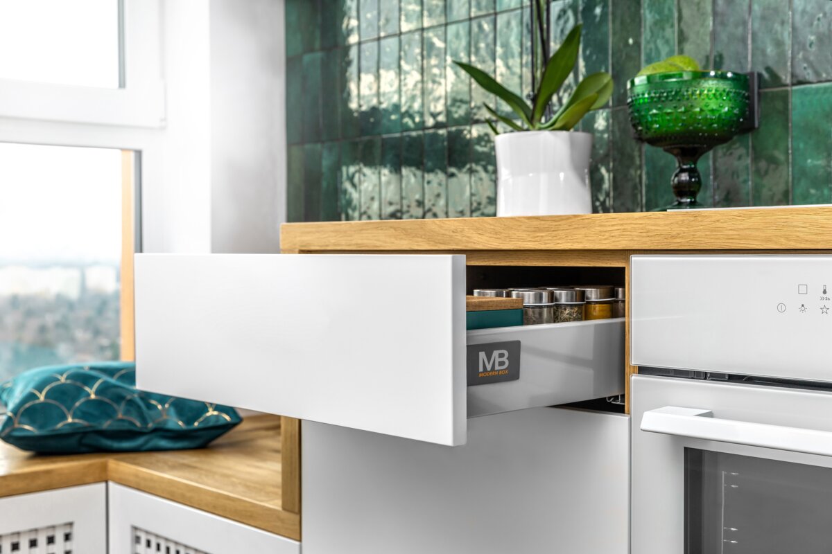 Szuflada Modern Box charakteryzuje się wysoką trwałością, certyfikowaną na 60 000 cykli (SGS). Zapewnia obciążenie do 40 kg oraz pełny wysuw w długościach między 250 a 550 mm. Występuje w 3 wariantach wysokości (83, 146, 210 mm) dla szuflad uniwersalnych, zarówno z frontem wpuszczanym, jak i nakładanym. Komfort pracy zapewnia synchronizacja toru pracy prowadnic. Szuflady wyposażone w mechanizm push to open – otwierają się po lekkim naciśnięciu frontu w odpowiednim miejscu, gwarantując natychmiastowy dostęp do zawartości. Do szuflady pasuje cała gama systemów organizacji przestrzeni, wkładów na sztućce, mat oraz sortowników na odpady.