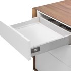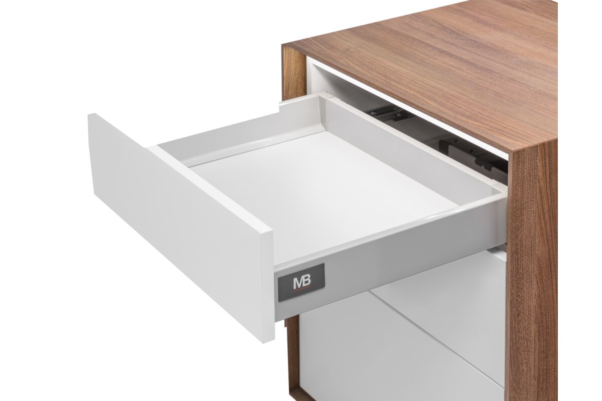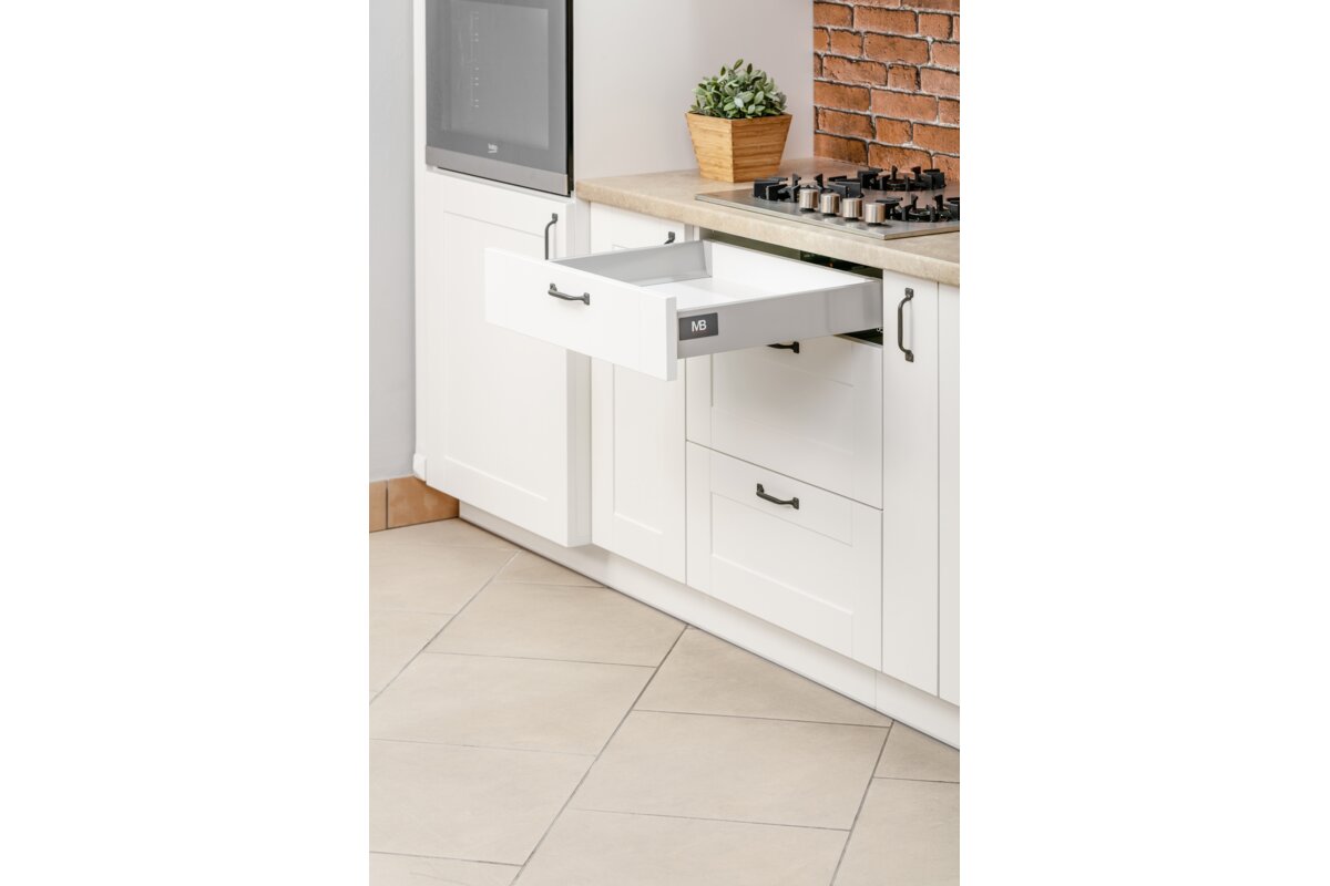 Szuflada Modern Box charakteryzuje się wysoką trwałością, certyfikowaną na 60 000 cykli (SGS). Zapewnia obciążenie do 40 kg oraz pełny wysuw w długościach między 250 a 550 mm. Występuje w 4 wariantach wysokości (68, 83, 146, 210 mm) dla szuflad uniwersalnych, zarówno z frontem wpuszczanym, jak i nakładanym. Wysoki komfort pracy produktu zapewnia cichy domyk i synchronizacja toru pracy prowadnic. Do szuflady pasuje cała gama systemów organizacji przestrzeni, wkładów na sztućce, mat oraz sortowników na odpady.