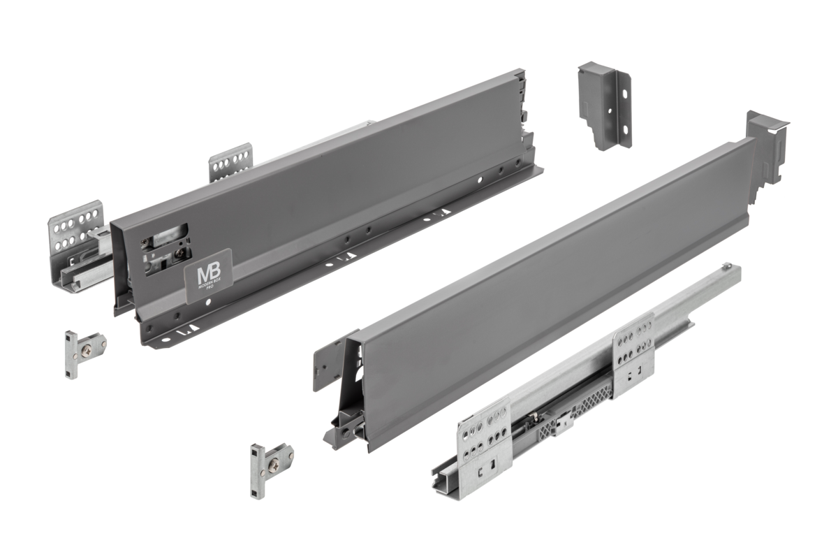 Modern Box Pro to ergonomiczne i nowoczesne rozwiązanie dla każdego rodzaju kuchni. Świetnie sprawdzi się zarówno w małych pomieszczeniach, gdzie liczy się każdy wolny metr, jak w i dużych przestrzeniach, które dają większe możliwości aranżacji. Modern Box Pro to odpowiedź na rosnące potrzeby klientów co do jakości akcesoriów kuchennych i komfortu ich użytkowania. System spełni oczekiwania nawet najbardziej wymagających użytkowników. Nowoczesną szufladę Modern Box Pro certyfikowano na 60 000 cykli. Produkt zapewnia obciążenie do 40 kg. Komfort pracy gwarantuje pełen wysuw w długościach od 300 do 550 mm, mechanizm cichego domyku oraz synchronizacja toru pracy prowadnic. Szuflada występuje w 4 wariantach wysokości (84, 135, 167, 199 mm), zarówno do frontów wpuszczanych, jak i nakładanych. Szufladę łatwo montuje się dzięki regulacji od wewnętrznej strony, jak również zakresowi regulacji pionowej i poziomej w zakresie +- 1,5 mm. Do szuflady pasuje cała gama systemów organizacji przestrzeni, wkładów na sztućce, mat oraz sortowników na odpady.