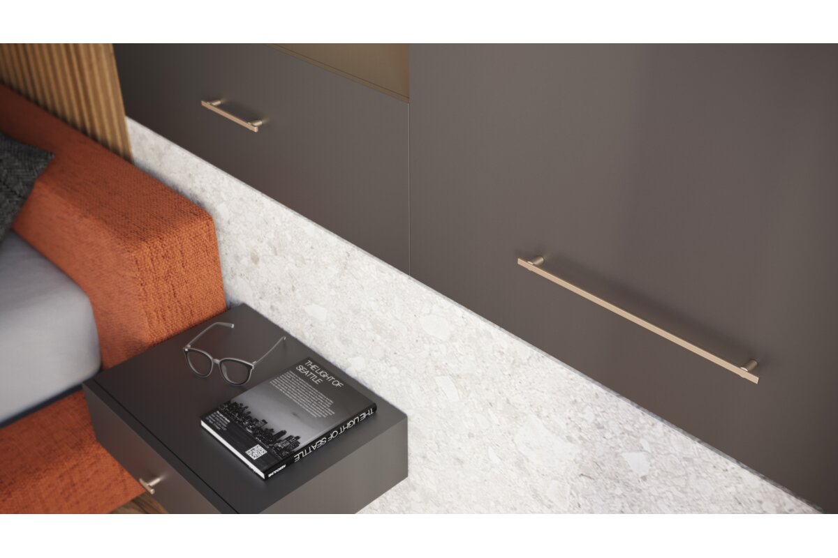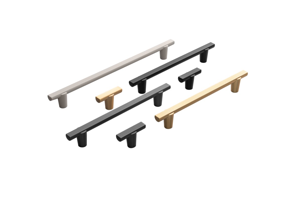 W naszej kolekcji RAY dostępne są uchwyty o trzech rozstawach: 128 mm, 192 mm, 320 mm oraz pasujące go nich gałki. Wszystkie produkty występują w kolorach: czarny mat, złoto szczotkowane jasny grafit i kaszmir.